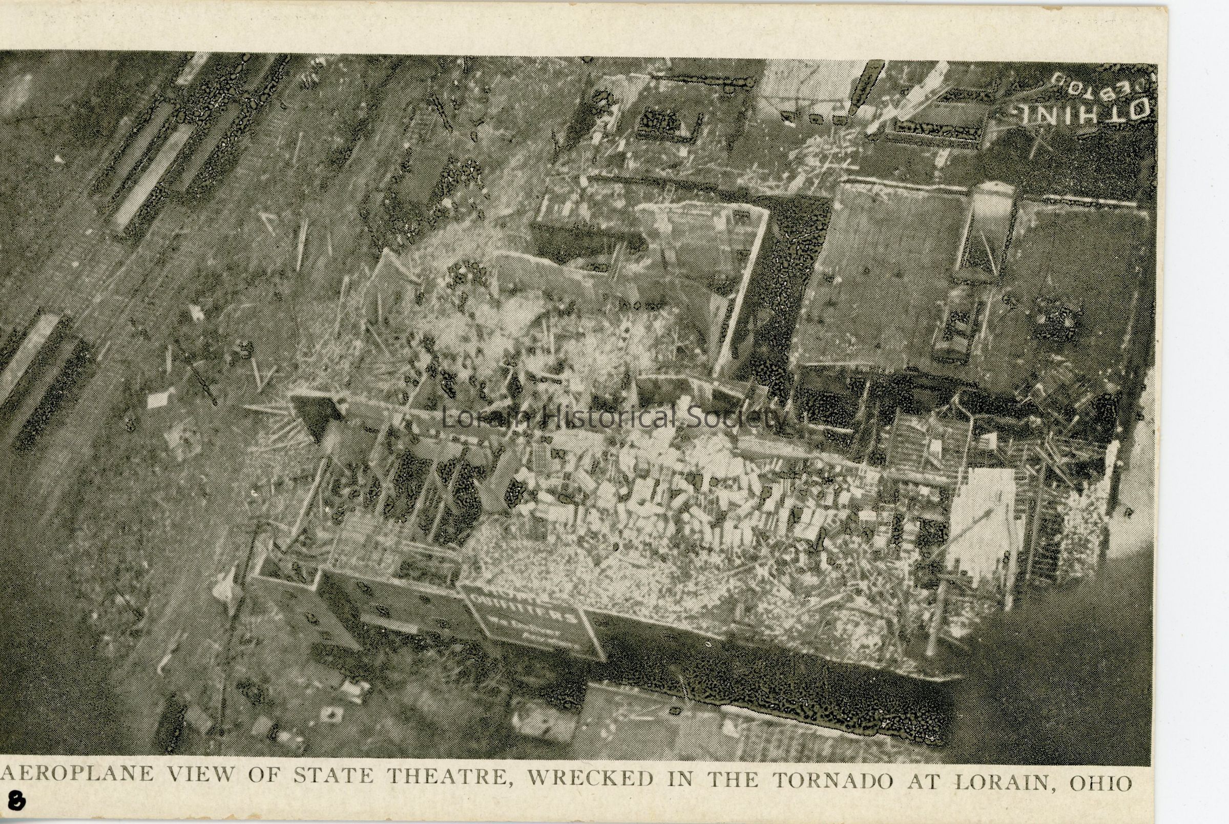 12/14/2022 AMS: cd07090167. jfm040808038. Black and white postcard is aerial view of State Theatre wreckage from 1924 Tornado. Postcard reads: "8. Aeroplane View Of State Theatre, Wrecked In The Tornado At Lorain, Ohio".