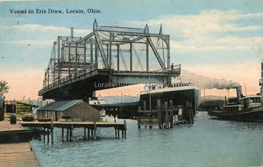 10/20/2021 AMS: Color Postcard is view of Vessel on the Erie Avenue Draw Bridge (Swing Bridge). Postcard reads: "Veseel on Erie Draw, Lorain, Ohio". 2 copies