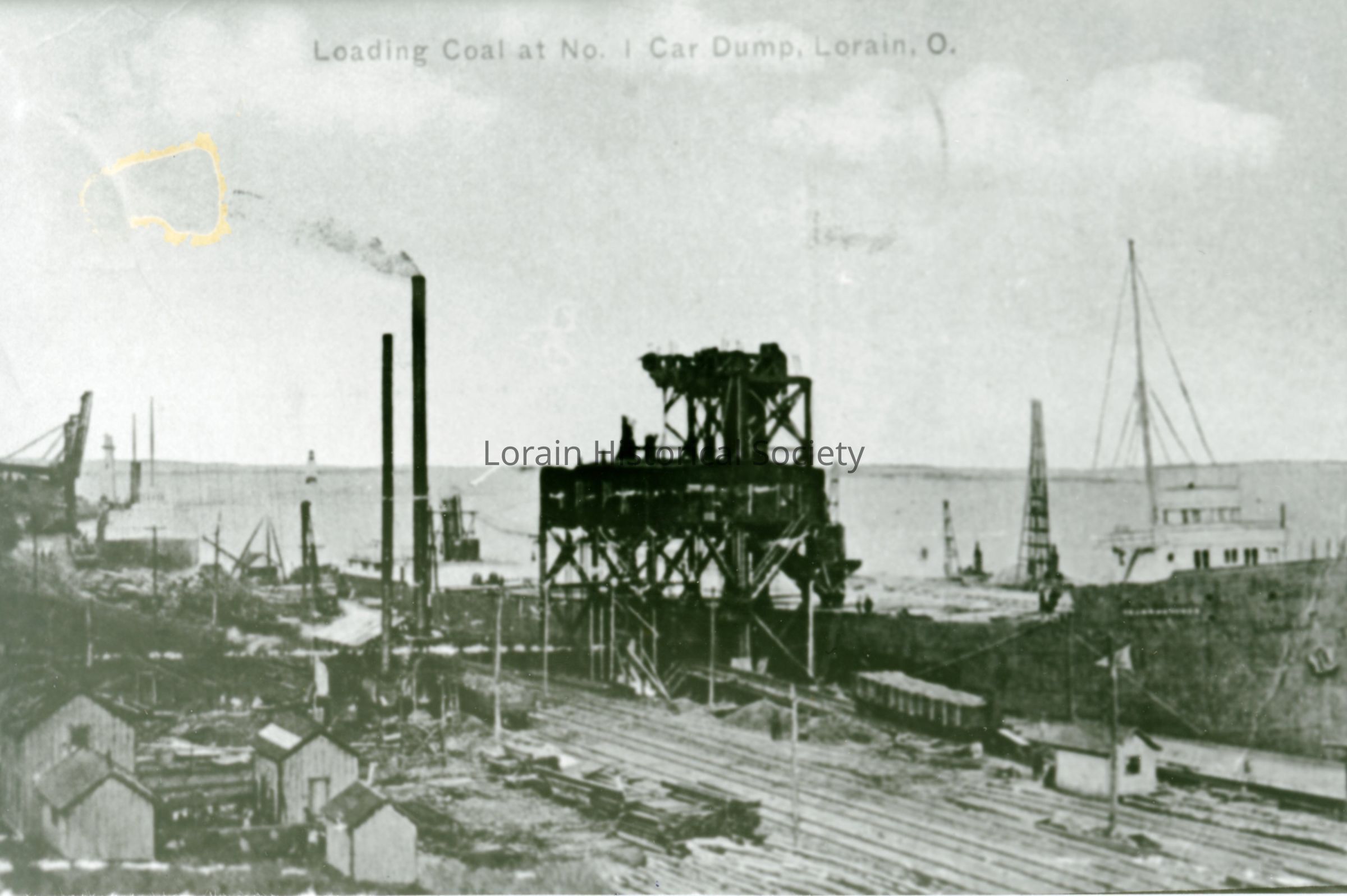 09/21/2022 AMS: jfm052505021. Black and White Photo of Postcard. Postcard photo is view of loading coal at No. 1 Car Dump, Black River, Lorain Harbor. Postcard reads: "Loading Coal at No. 1 Coal Dump, Lorain, O."