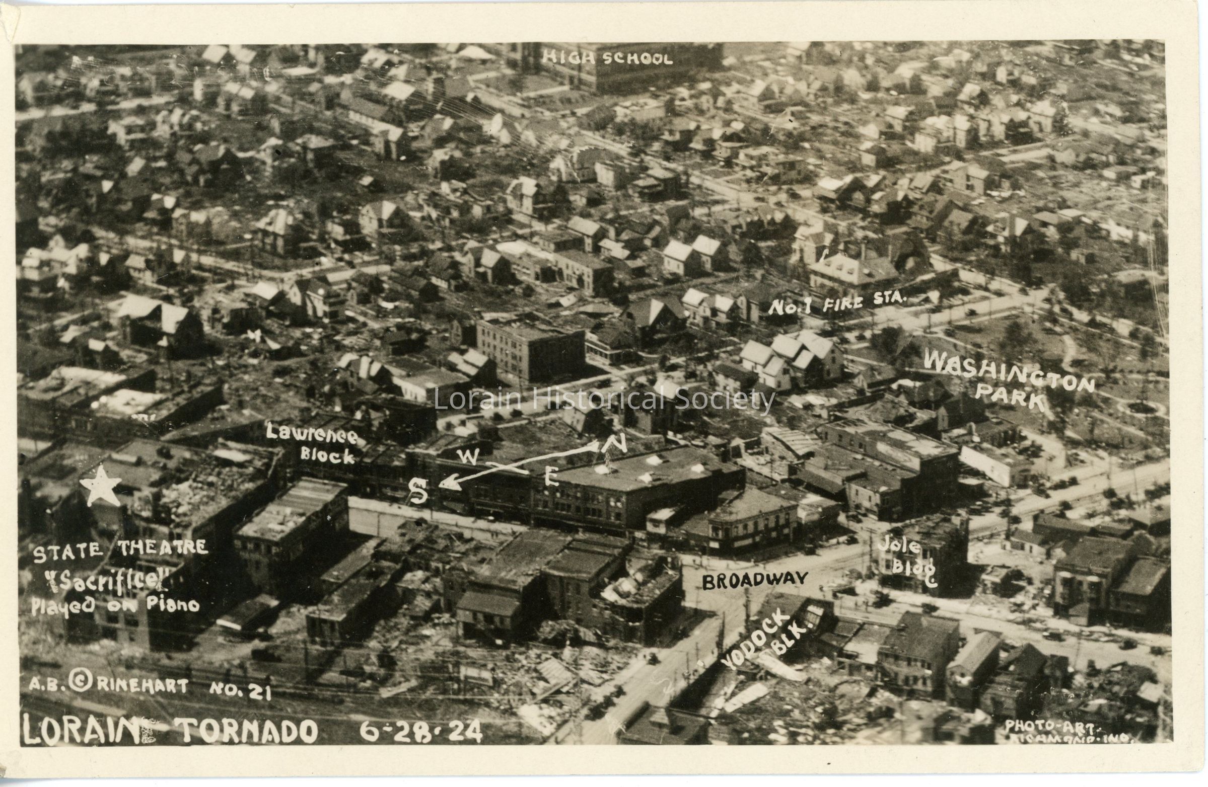 Postcard is aerial view of Lorain Business District and Residential Section after 1924 Tornado, noting locations of High School, No. 1 Fire Station, Washington Park, Broadway, Lawrence Block, State Theatre ("Sacrifice" Played on Piano), Jole Building, and YODock. Postcard reads: "LORAIN TORNADO 6-28-24 NO. 21 A. B. RINEHART PHOTO ART RICHMOND IND".