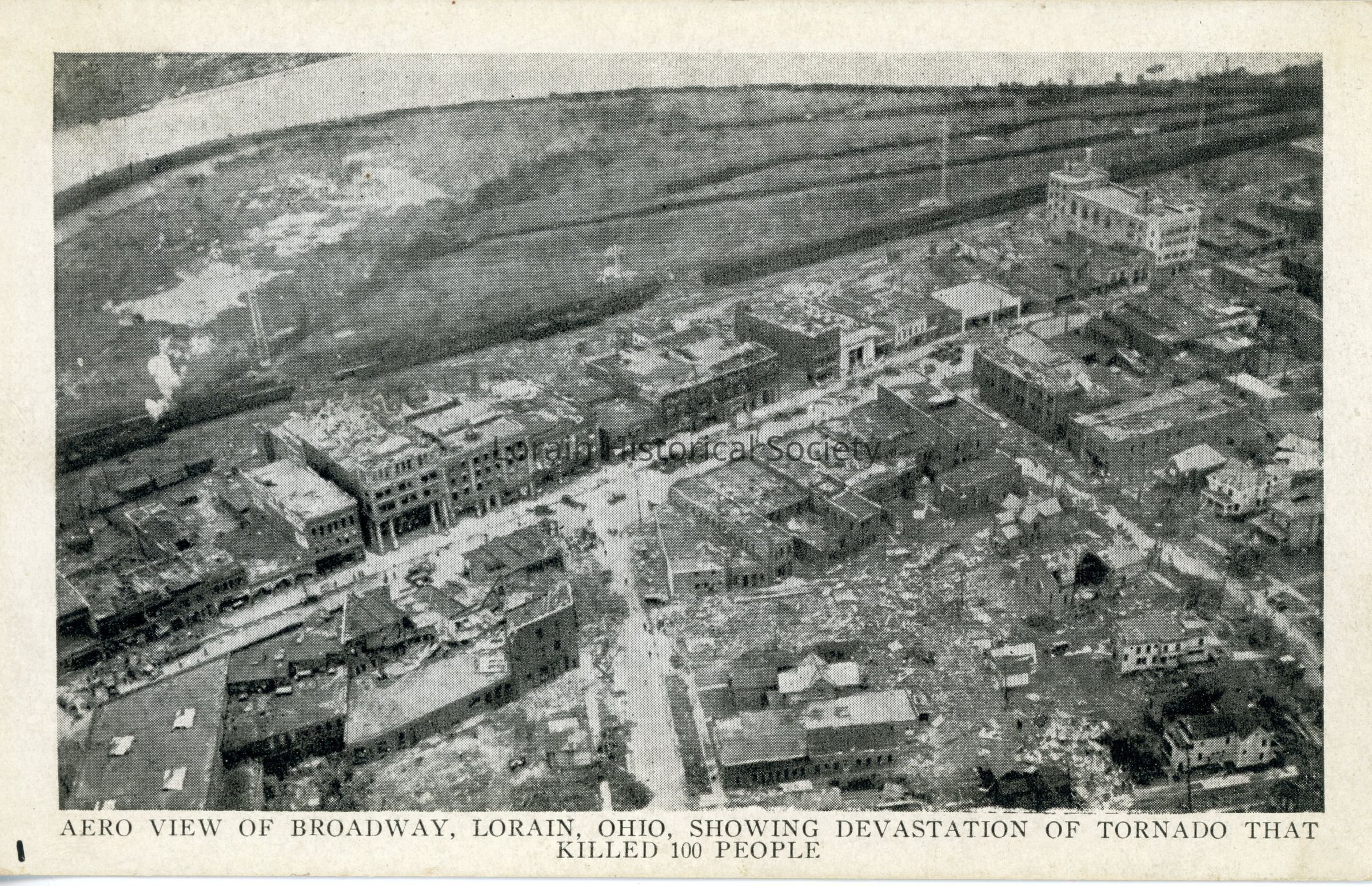 Black and White Postcard - Aerial View of Broadway Showing Devasation of Tornado That Killed 100 People