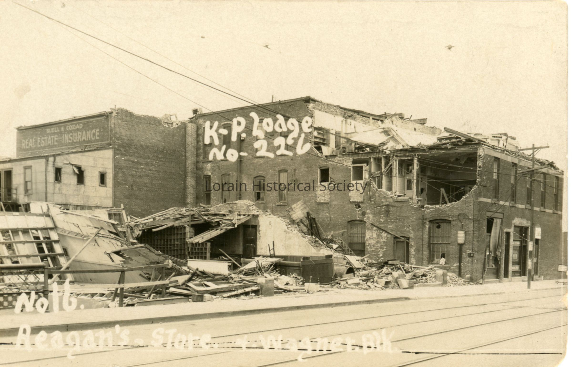 Postcard is view of Reagan's Grocery Store, K. P. Lodge No. 226 and Wagner Block showing damage from 1924 Tornado. L to R: Broadway Building: George Buell and Joseph Cozad Real Estate and Insurance; K-P Lodge, No. 226. In front: Reagan's Grocery Store, 10 East Erie Avenue.