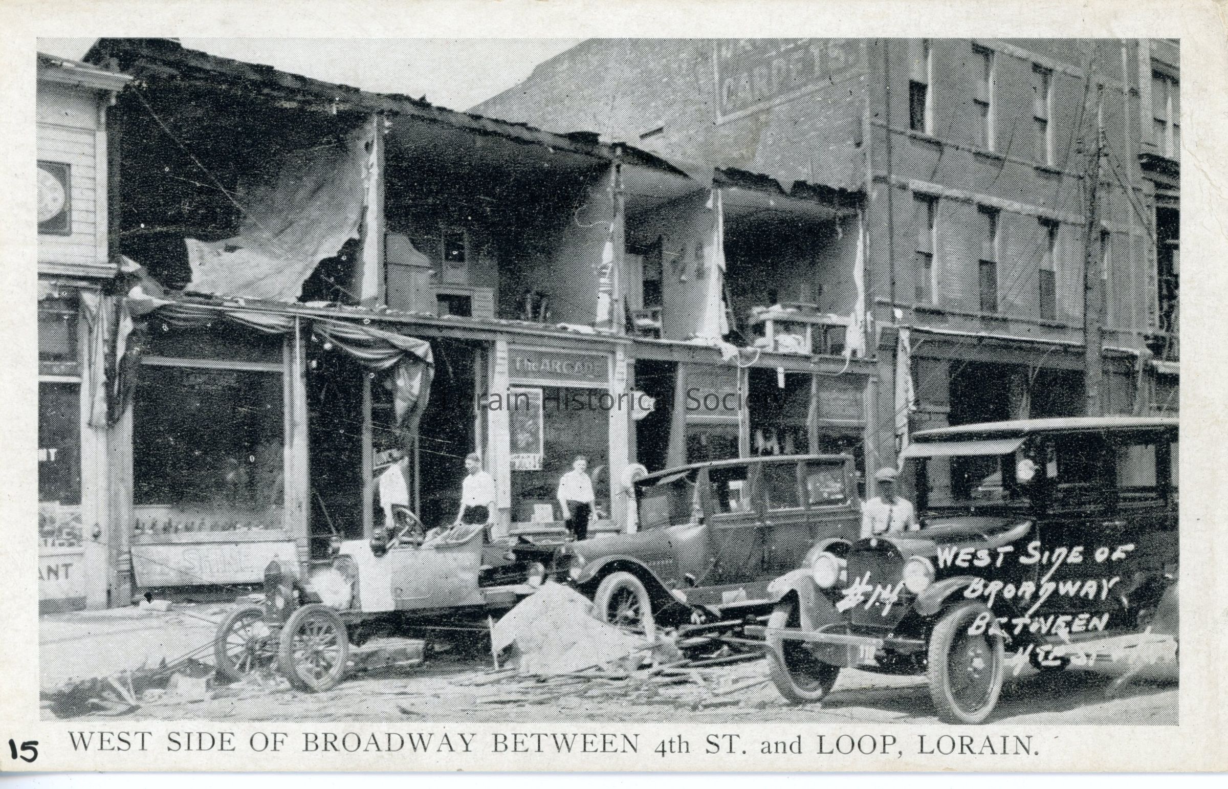 12/14/2022 AMS: cd07090174. jfm040808040. 82.4.60. Black and white postcard is view of west side of Broadway between 4th Street and the Loop showing tornado damage to buildings and autos. Postcard reads: "15. West Side Of Broadway Between 4th St. and Loop, Lorain".