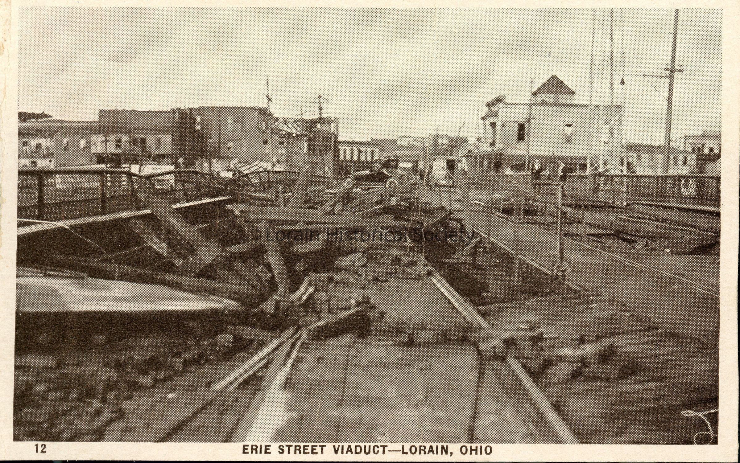 Postcard is view of Erie Avenue Viaduct at the corner of West Erie Avenue and Broadway looking West from bridge showing damage from 1924 Tornado. L to R: Wagner Building (corner of West Erie Avenue and Broadway); Reagan's Grocery (debris behind Wagner Building); Heilman's Restaurant (corner of West Erie Avenue and Broadway, across the street from Wagner Building); Swamp Lily Hotel (corner of North Broadway and West Erie Avenue). Postcard reads: "No. 12. Erie St. Viaduct, Lorain, Ohio".Acquisition