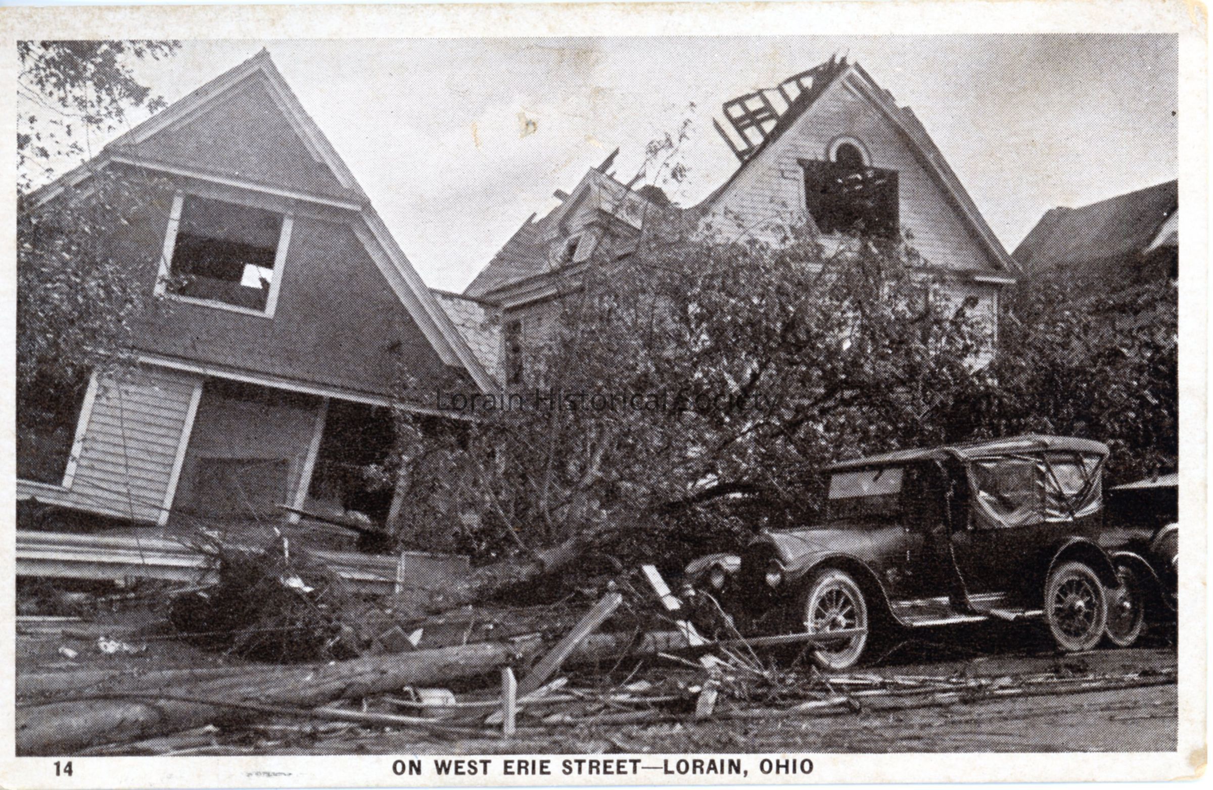 11/09/2022 AMS: cd07040143. jfm040808032. Black and white postcard is view of tornado damage to houses on West Erie Avenue between Brownell and Oberlin. L to R: 1230 West Erie Avenue, Anna Braun Home; 1234 West Erie Avenue, Sarah A. Showalter Home; 1236 West Erie Avenue, John C. Jones Home. Postcard reads: "14. On West Erie Street - Lorain, Ohio".