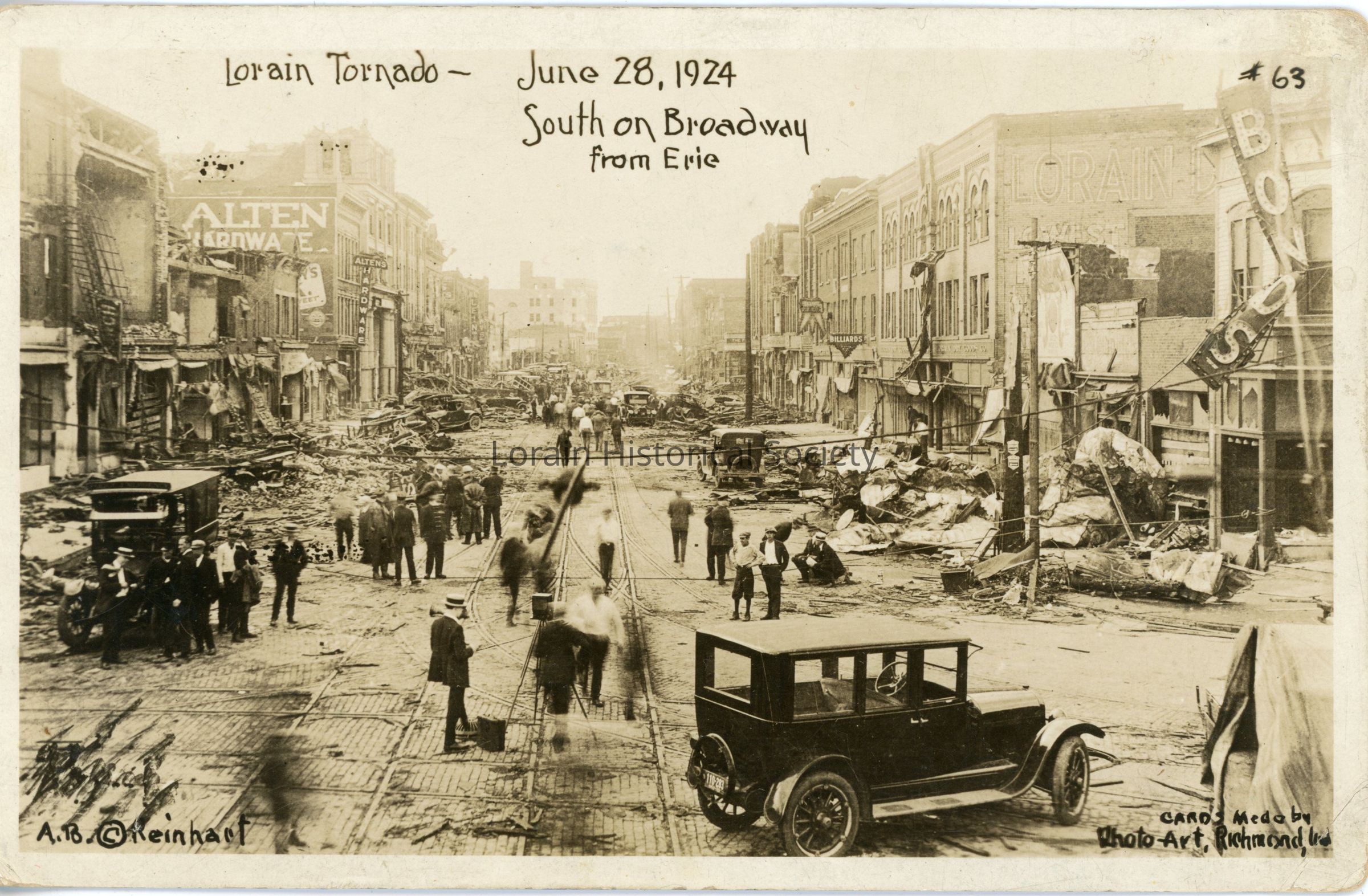 Postcard is view of Broadway, looking south from West Erie Avenue, showing damage after 1924 Tornado. Bond's sign was blown off building and thrown into building on opposite side of the street. Postcard reads: "LORAIN TORNADO June 28, 1924 South on Broadway from Erie #63 A. B. Reinhart Card made by Photo Art Richmond Ind".Acquisition