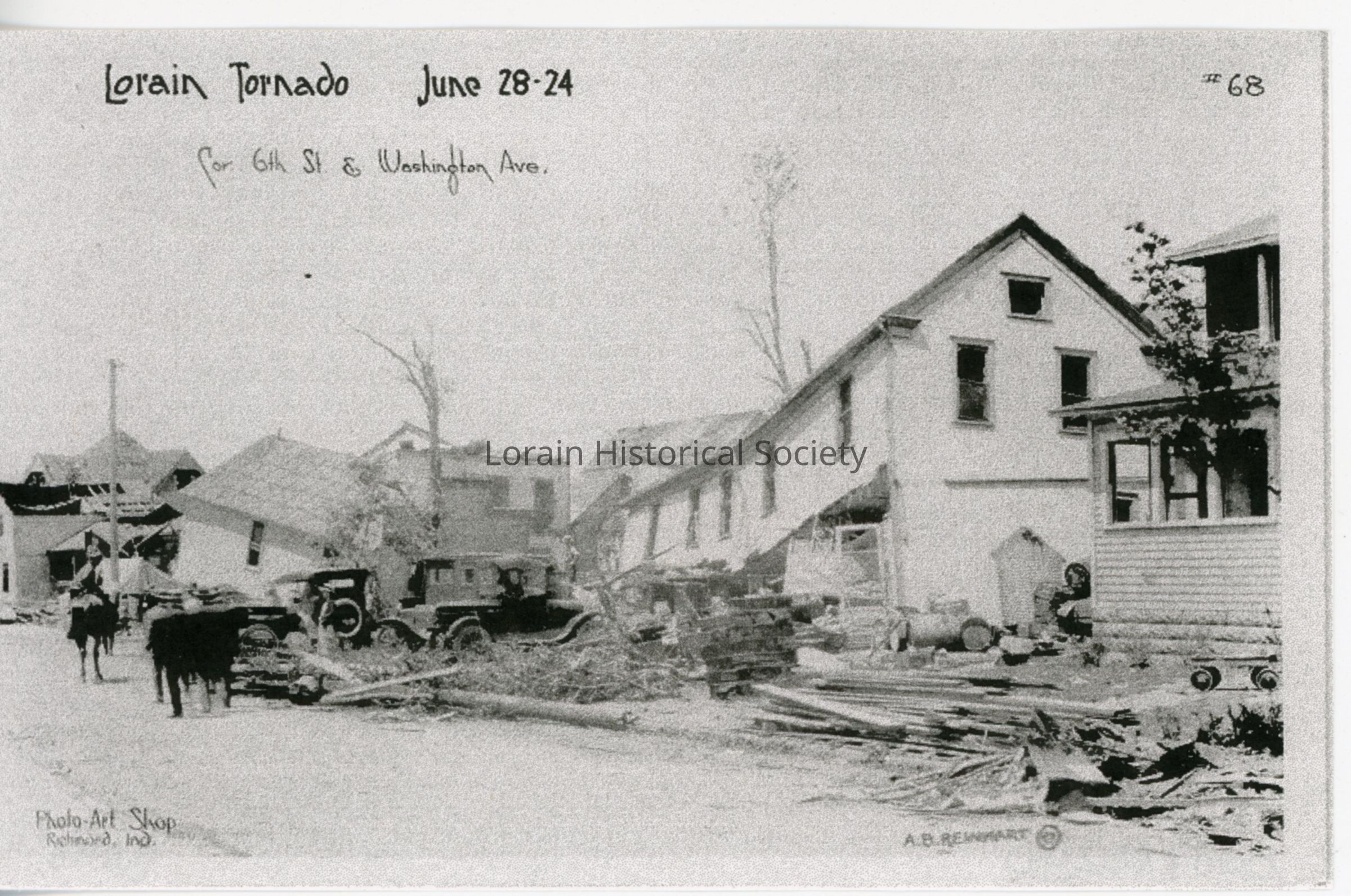Postcard is view of the corner of West Sixth Street and Washington Avenue showing damage from 1924 Tornado. Postcard reads: "Lorain Tornado June 28-24 #68 Cor. 6th St. & Washington Ave. Photo Art Shop, Richmond, Ind. A. B. Reinhart". L to R: 1008 West Sixth Street, Harriet and Frank S. Naylor Home; 1012 West Sixth Street, Adda and Harry Naylor Home; 560 Washington Avenue, Gould's Grocery Store; 565 Washington Avenue, Zittell's Grocery Store; 904 West Sixth Street, Hannah and Frank B. Hampton Home.Acquisition