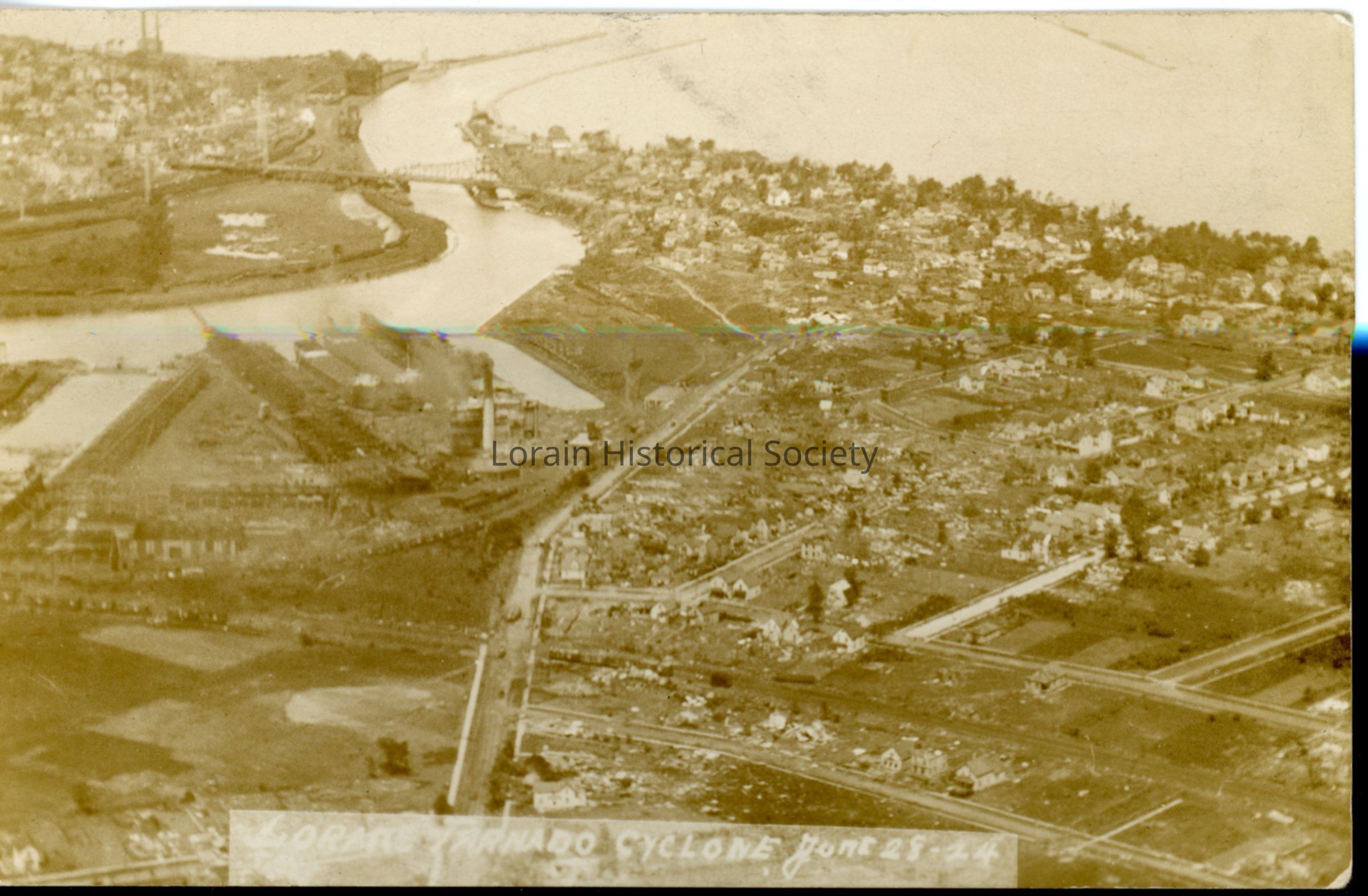 Postcard is aerial view of Lorain East Side and Black River at Lake Erie showing damage from 1924 Tornado. Postcard reads: "LORAINE TORNADO CYCLONE June 28-24".Acquisition