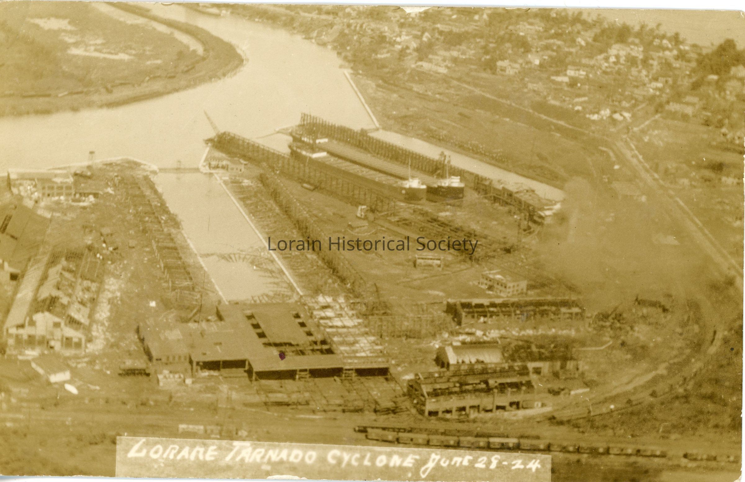 Postcard is aerial view of American Shipbuilding Co. showing damage from 1924 Tornado. Postcard reads: "LORAINE TORNADO CYCLONE June 28-24".Acquisition