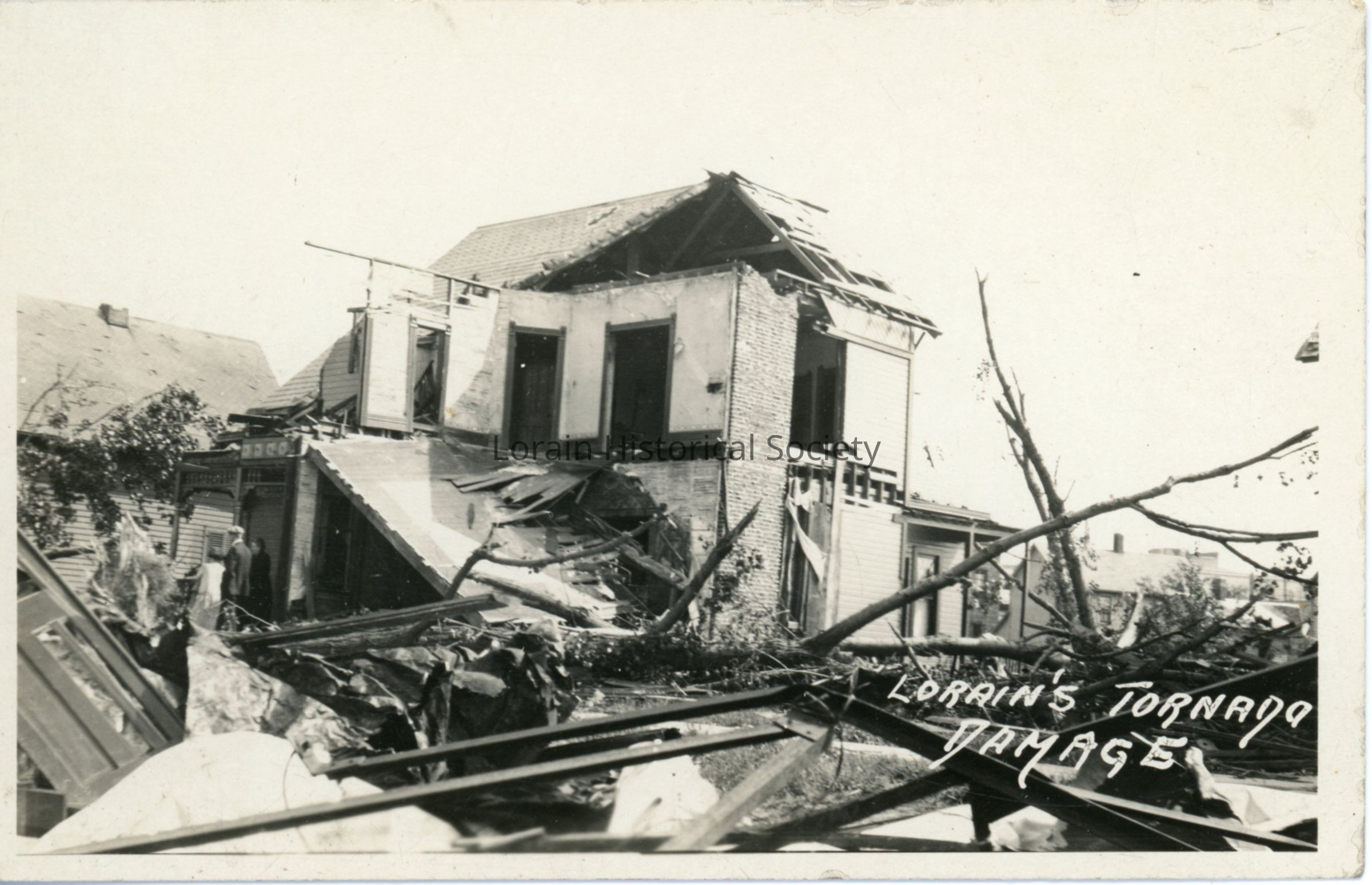 Postcard is view of 172 North Broadway, Gertrude and Henry Long Home, showing damage after 1924 Tornado. Postcard reads: "LORAIN'S TORNADO DAMAGE".Acquisition