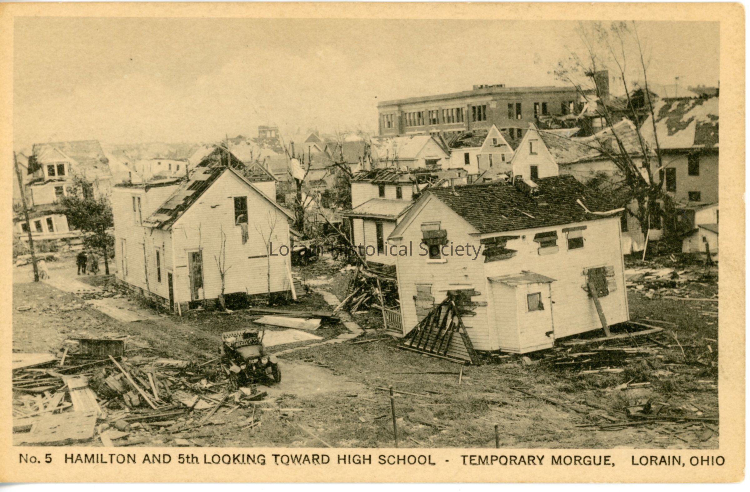 Postcard is view of Hamilton Avenue and West Fifth Street looking toward Lorain High School (temporary morgue), showing damage from 1924 Tornado. Postcard reads: "NO. 5. HAMILTON AND 5th LOOKING TOWARD HIGH SCHOOL - TEMPORARY MORGUE, LORAIN, OHIO".Acquisition