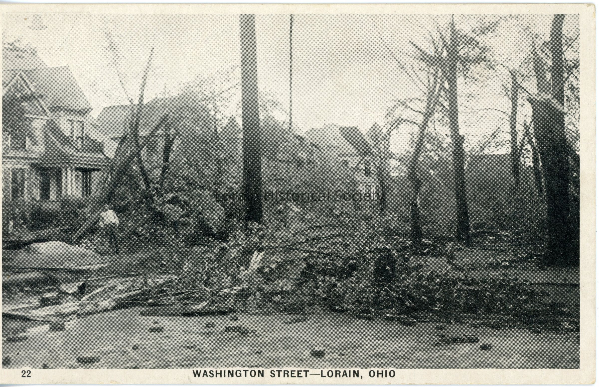 11/30/2022 AMS: cd07090152. jfm040808034. Black and white postcard is view houses and damage onWashington Avenue after 1924 Tornado. Postcard reads: "22. Washington Street -- Lorain, Ohio".