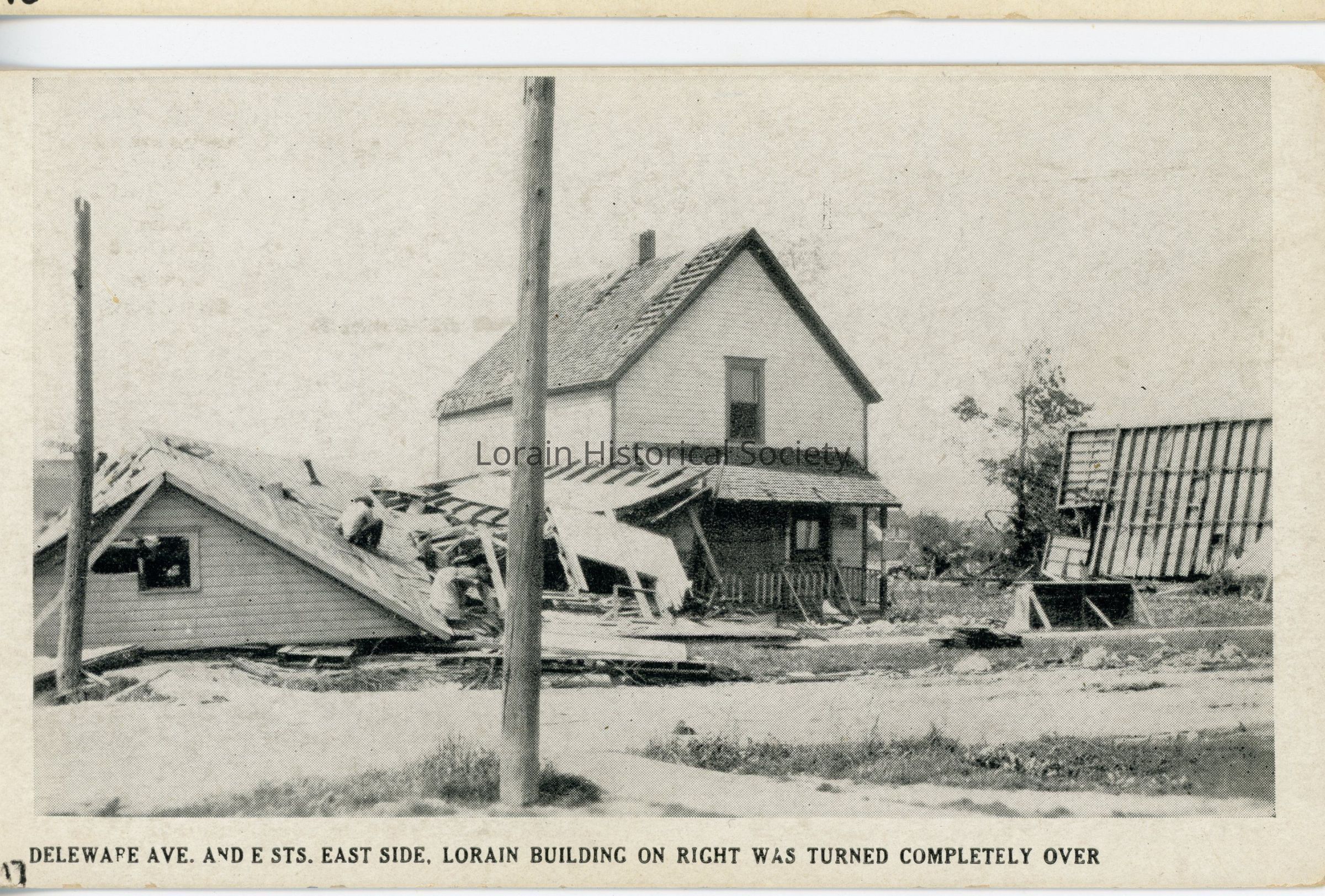 Postcard is view of homes on Delaware Avenue damaged by 1924 Tornado. Postcard reads: "Delaware Ave. and E Sts., East Side, Lorain, Building on Right Side was turned completely over."