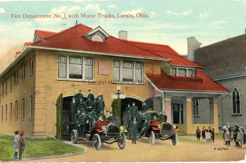 08/17/2022 AMS: jfm122303011. Color postcard is view of No. 1 Fire Station with trucks parked in front and Congregational Church next door. Postcard reads: "Fire Department No. 1 with Motor Trucks, Lorain, Ohio".