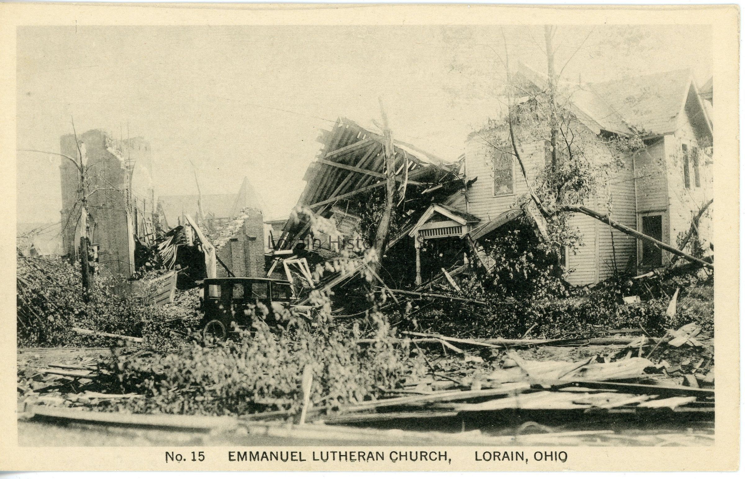 Postcard is view of Emmanuel Evangelical Church, corner of Reid Avenue and West Sixth Street, showing damage and destruction from 1924 Tornado. Postcard reads: "No. 15. Emmanuel Lutheran Church, Lorain, Ohio".Acquisition