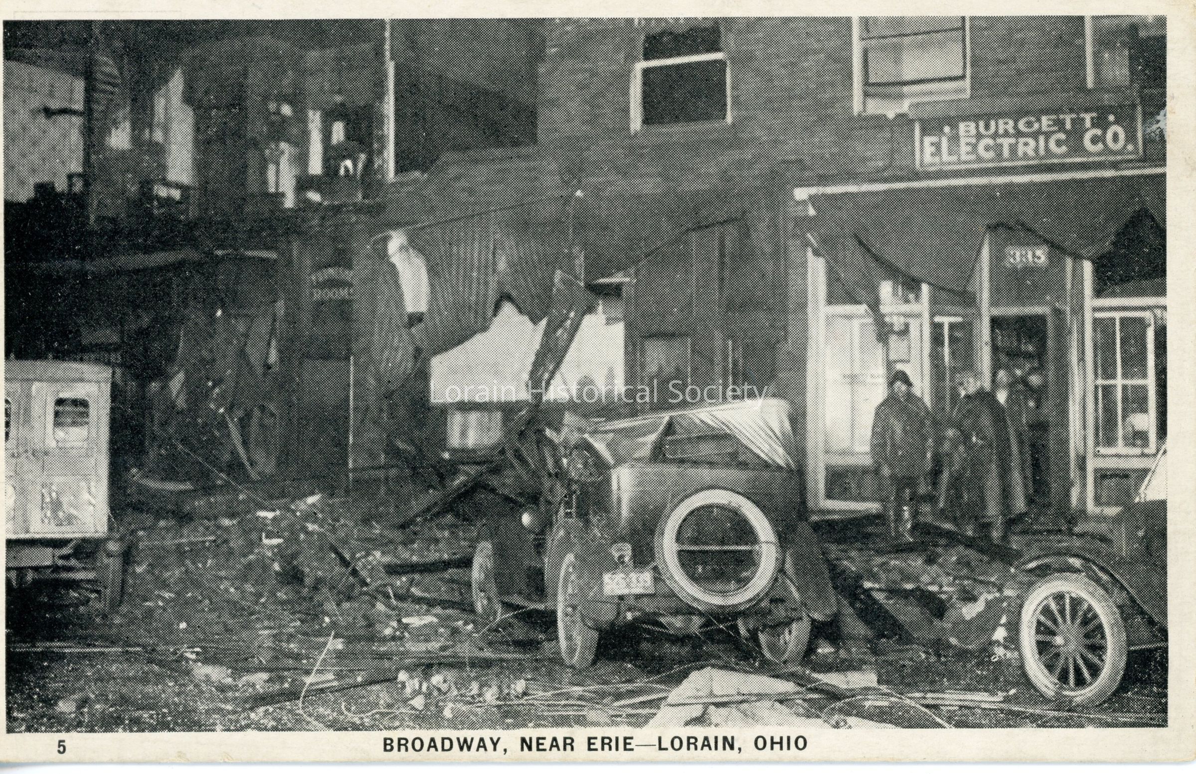 11/02/2022 AMS: cd07090134. jfm040808030. 82:2. Black and white postcard is view of John Burgett Electrical Co., 335 Broadway, after 1924 Tornado on Broadway, near Erie Avenue. Postcard reads: "5. Broadway, Near Erie - Lorain, Ohio".