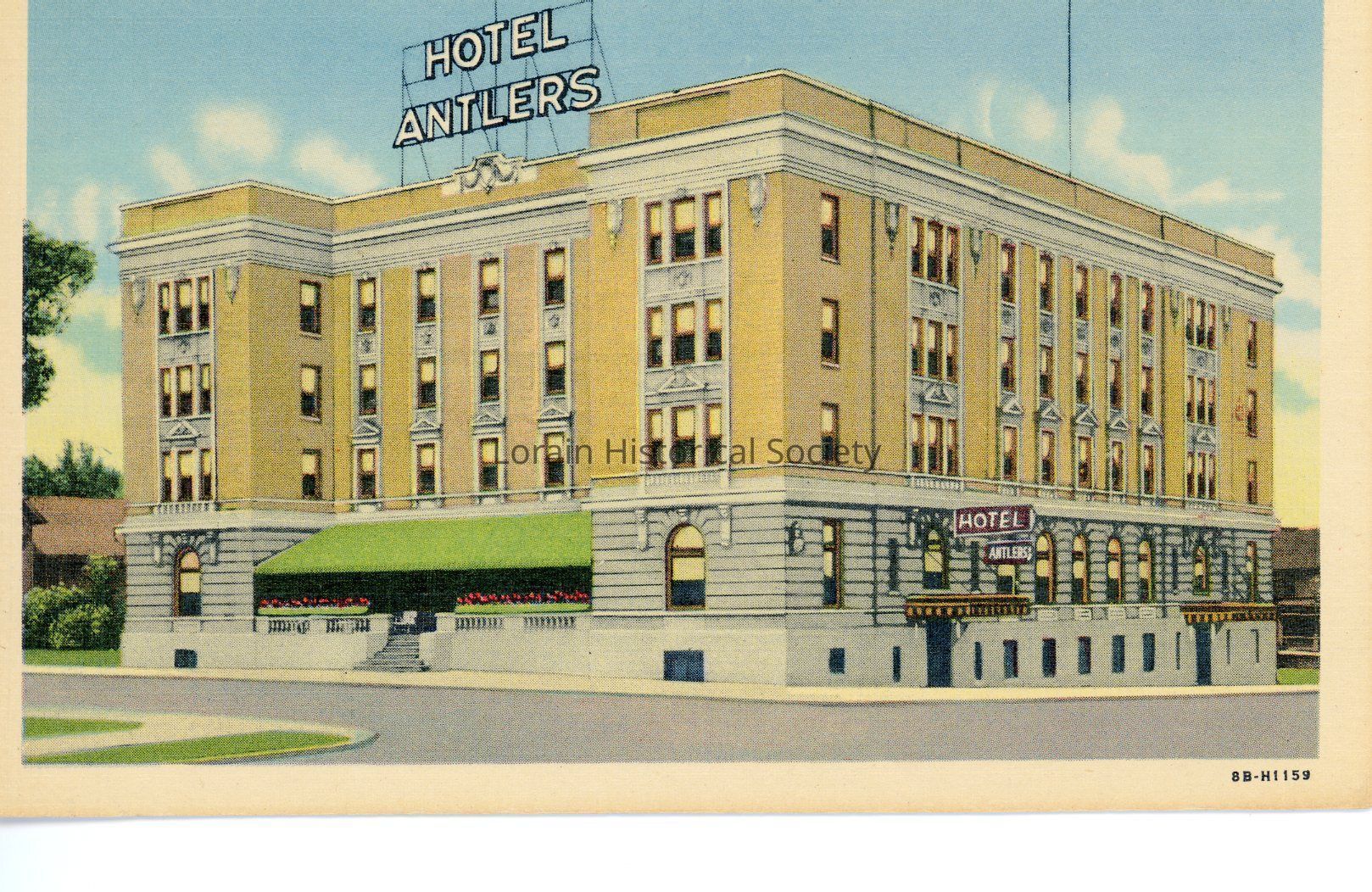 Also in file: Color Photo of Postcard with same picture as postcard above. Postcard photo reads: "Hotel Antlers, Lorain, Ohio."