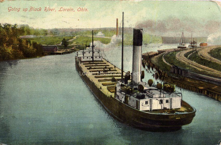 07/28/2021 AMS: Color Postcard is view of ship coming into Black River. Postcard reads: "Going up Black Rvier, Lorain, Ohio."