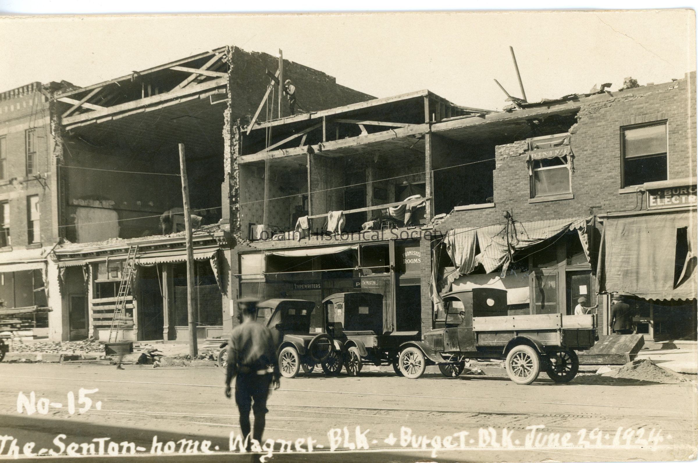 Postcard is view of the Senton Home in the Wagner Block on Broadway near Burgett Electric. Postcard reads: "No. 15. The Senton home Wagner BLK + Burget BLK June 29 1924".Acquisition