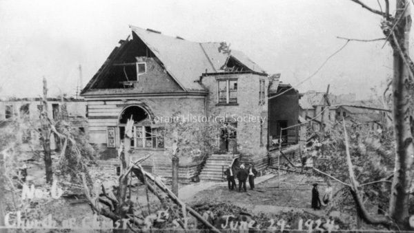 Postcard is view of Church of Christ on Fifth St. after the 1924 Tornado. Postcard reads: "No-6. Church of Christ 5th St June 29 1924".Acquisition