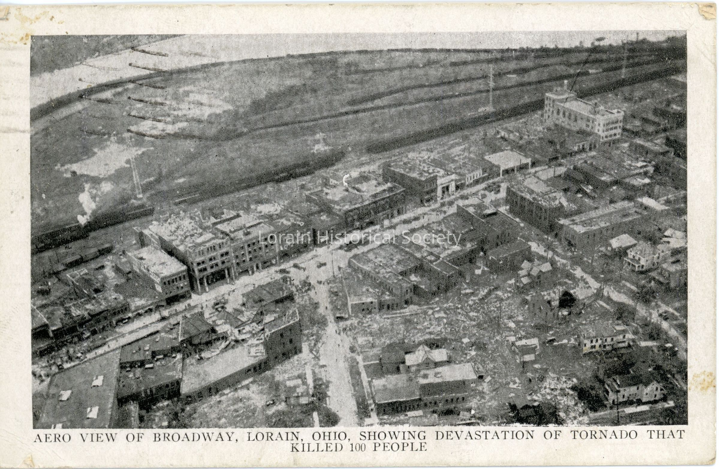 Postcard is black and white aerial view of Broadway showing damage, destruction and debris from 1924 Tornado.