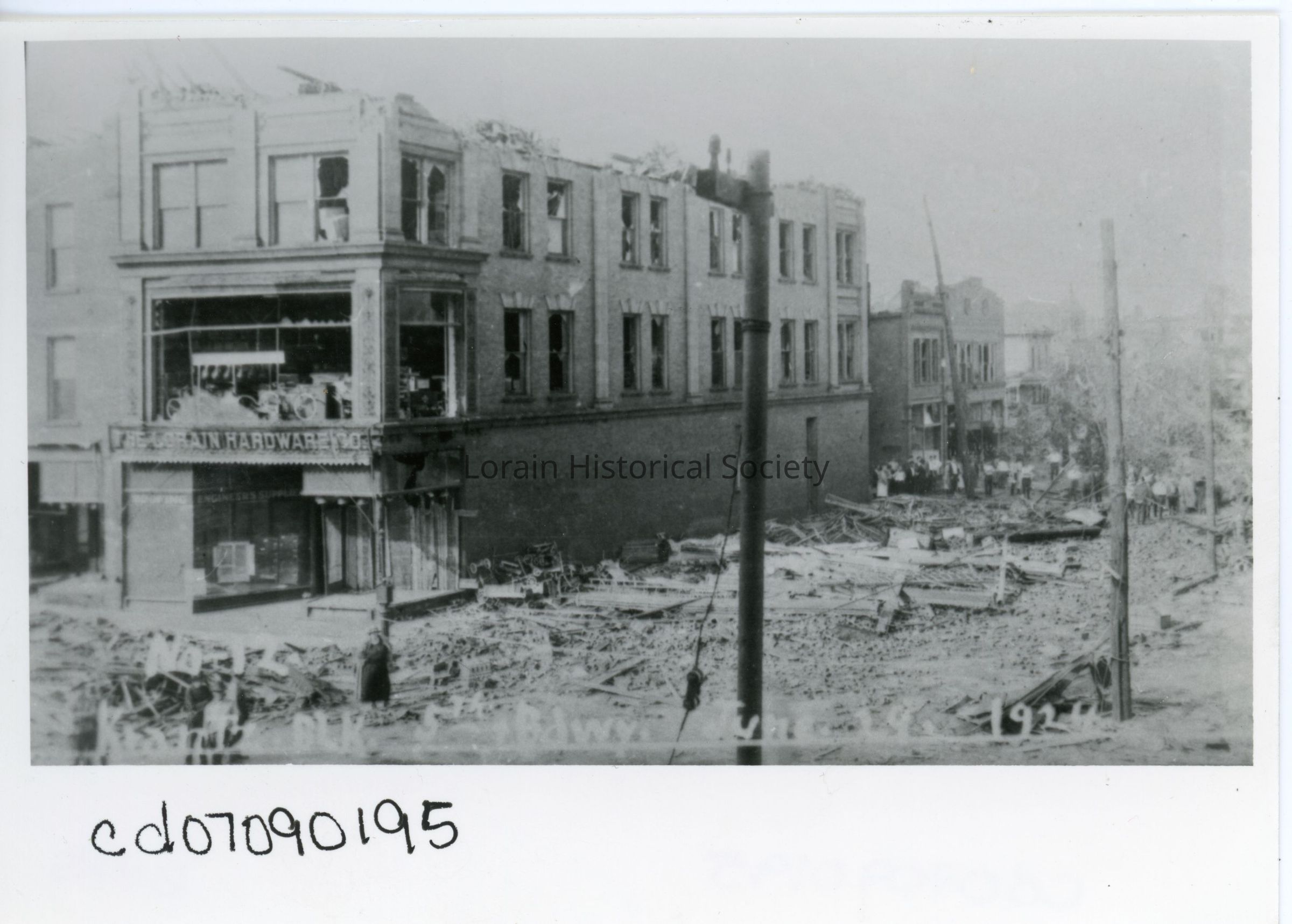 Photograph of postcard is black and white view of Lorain Hardware Co., 502 Broadway (corner of Broadway and West Fifth Street), showing damage, destruction and debris from 1924 Tornado.