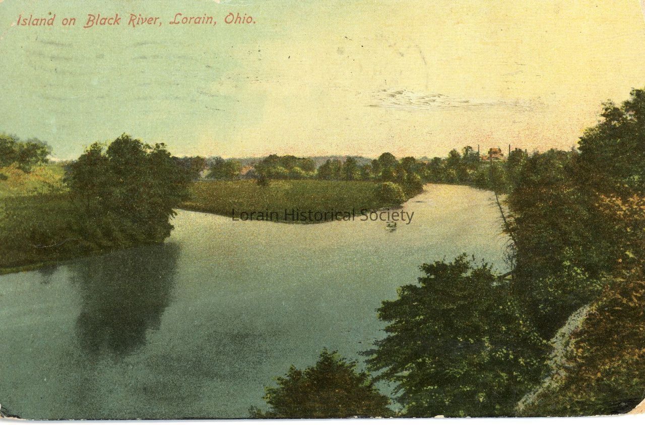 Postcard is color view of the island on the Black River.