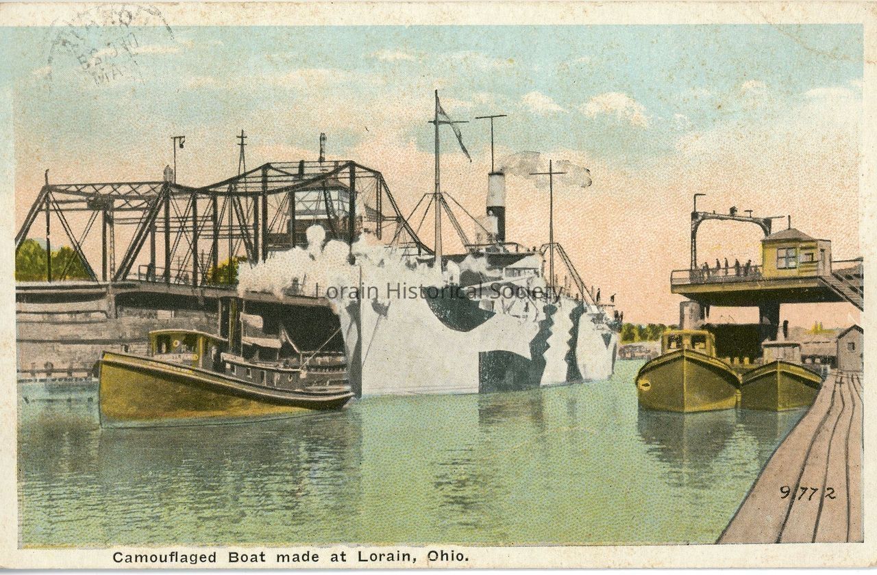 Postcard is color view of Camouflaged boat constructed in Lorain Shipyards.