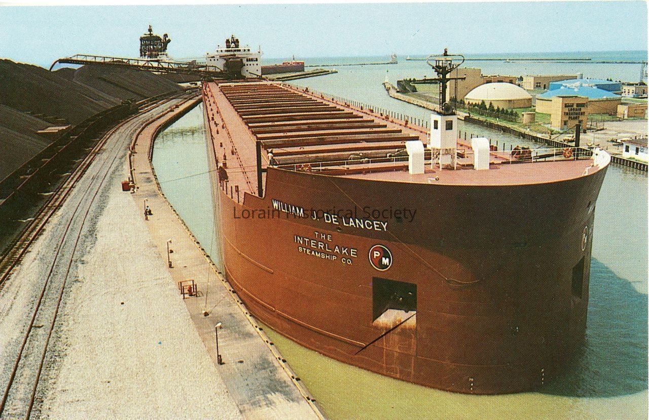 Postcard is color view of the William J. Delancey, The Interlake Steamship Co., a Great Lakes ore carrier docked at the Lorain ore docks on the Black River.