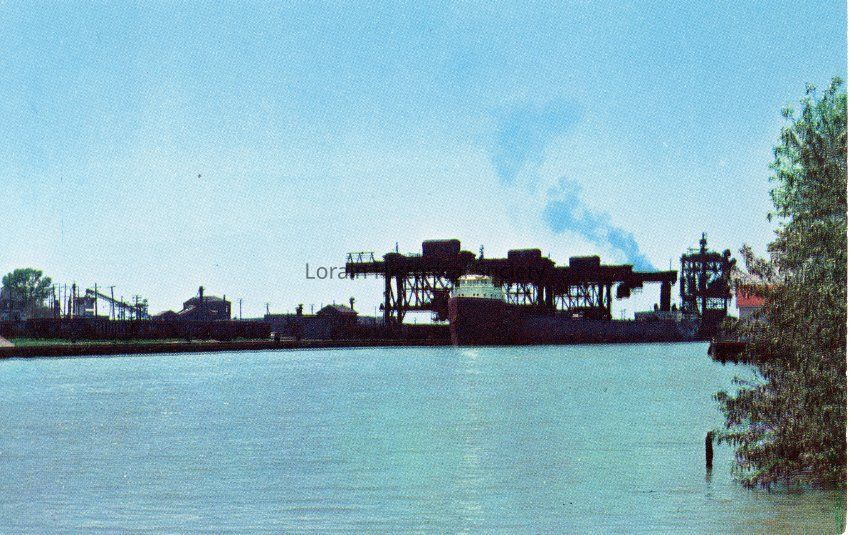07/07/2021 AMS: cd0827021. Color Postcard. Postcard reads: "SITE OF B & O CARGO LOADER. 1000 cargoes of Iron ore, coal, limestone, and oil pass through Lorain Harbor. Coast Guard Station is located on the mount of the harbor. 2 copies.