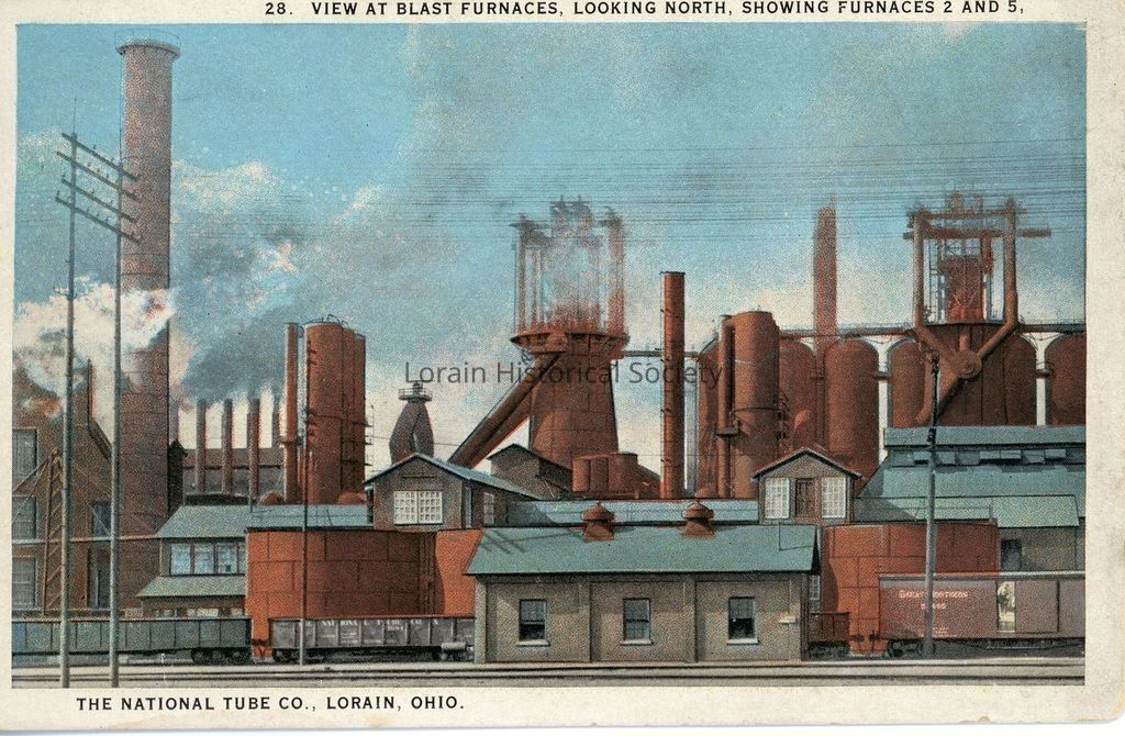 Postcard is color view of National Tube Co. Blast Furnaces looking north, Furnaces 2 and 5.