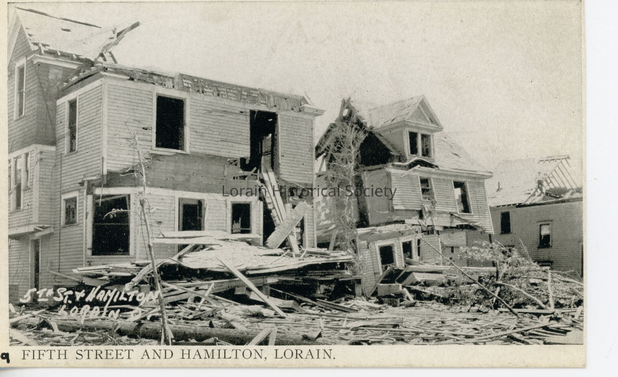12/14/2022 AMS: cd07090168. jfm040808039. Black and white postcard is view of tornado damage on West Fifth Street and Hamilton Avenue; East side of street, L to R: 517 Hamilton Avenue, Lynota & Edward Lyons Home; 527 Hamilton Avenue, Mattie & Andrew Braun Home; 539 Hamilton Avenue, James Ewers Home. Postcard reads: "9. Fifth Street and Hamilton, Lorain, Ohio".