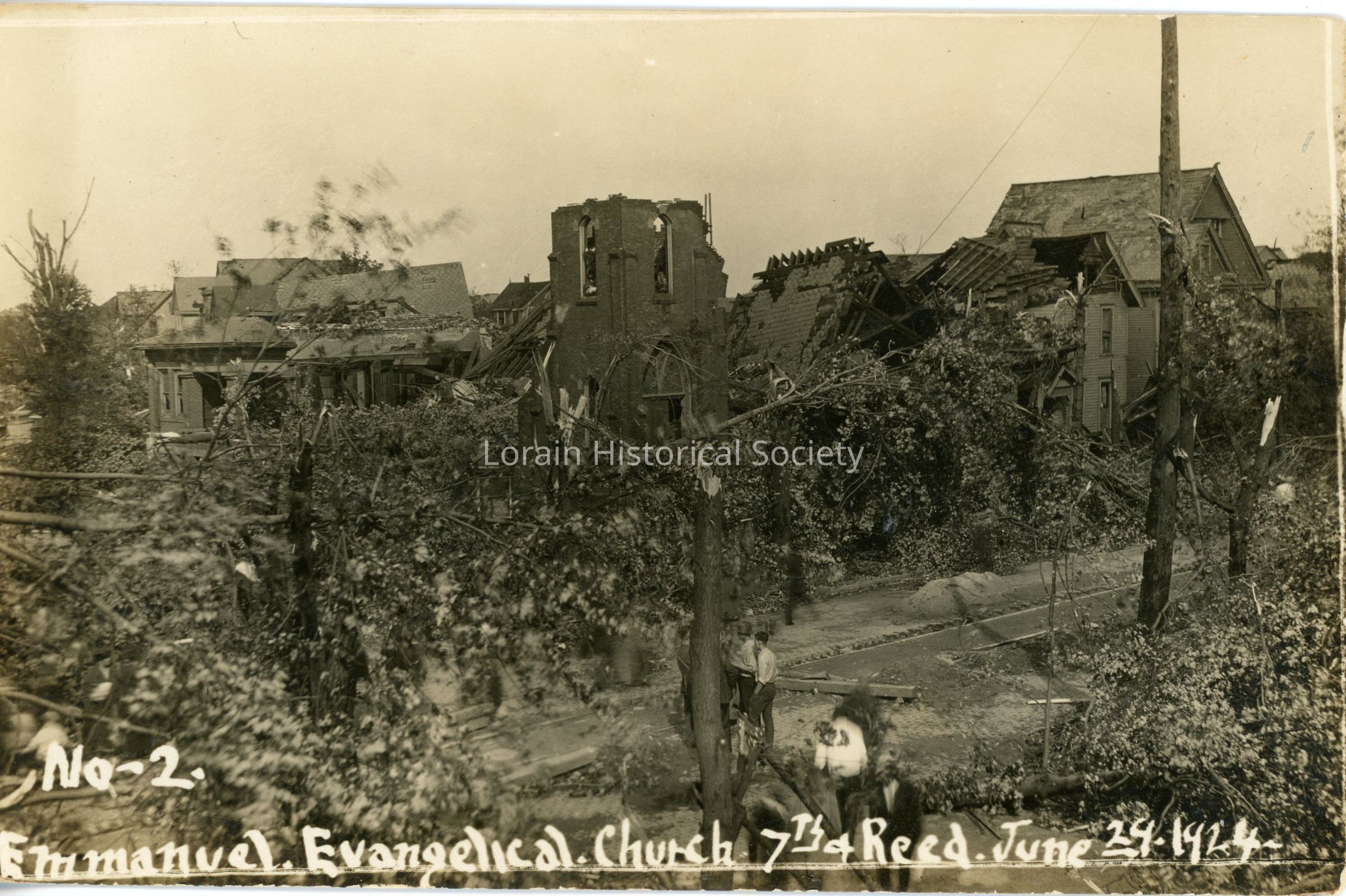 Postcard is view of Emmanuel Evangelical Church Showing Damage from 1924 Tornado. Postcard reads: "No-2. Emmanuel Evangelical Church 7th & Reed June 29 1924".Acquisition