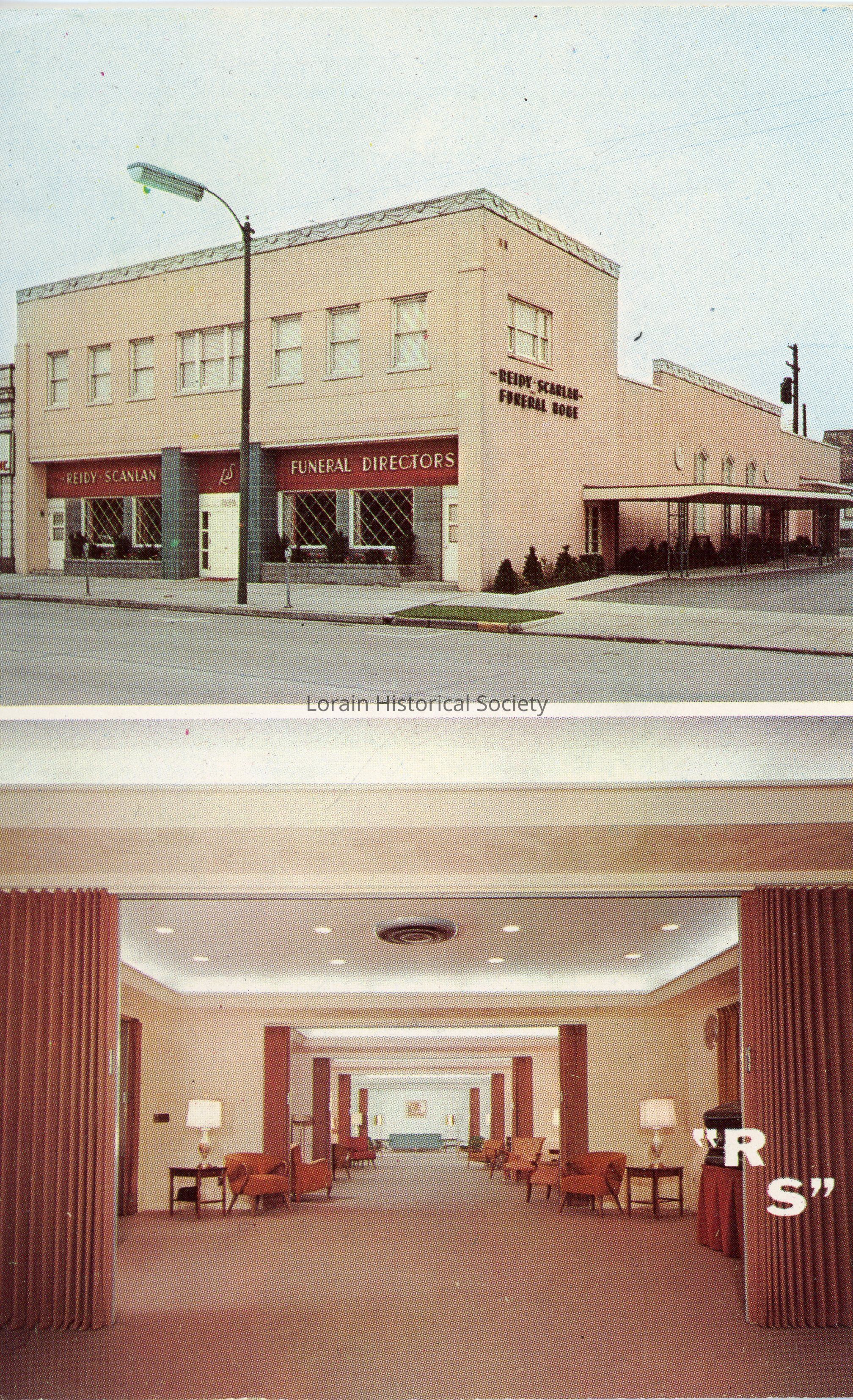 02/23/2022 AMS: 97:19. Color postcard is view of exterior and interior of Reidy-Scanlan Co. Funeral Home. Postcard reads (on back): "THE REIDY-SCANLAN CO. Funeral Directors since 1905. 2150 Broadway. Phone CHerry 4-1961. Lorain, Ohio. Lorain's oldest funeral directing firm, with Northern Ohio's finest facilities in a large, modern, completely winter-summer air conditioned funeral home. Centrally located with our large private parking lot adjoining. There are six spacious parlors, a large formal chapel, a casket display room, kitchen and dining facilities, spacious lobby, offices and louge -- all located o the ground floor. Twenty-four hour ambulance and invalid car service. Lady Attendant." 2 copies in file.