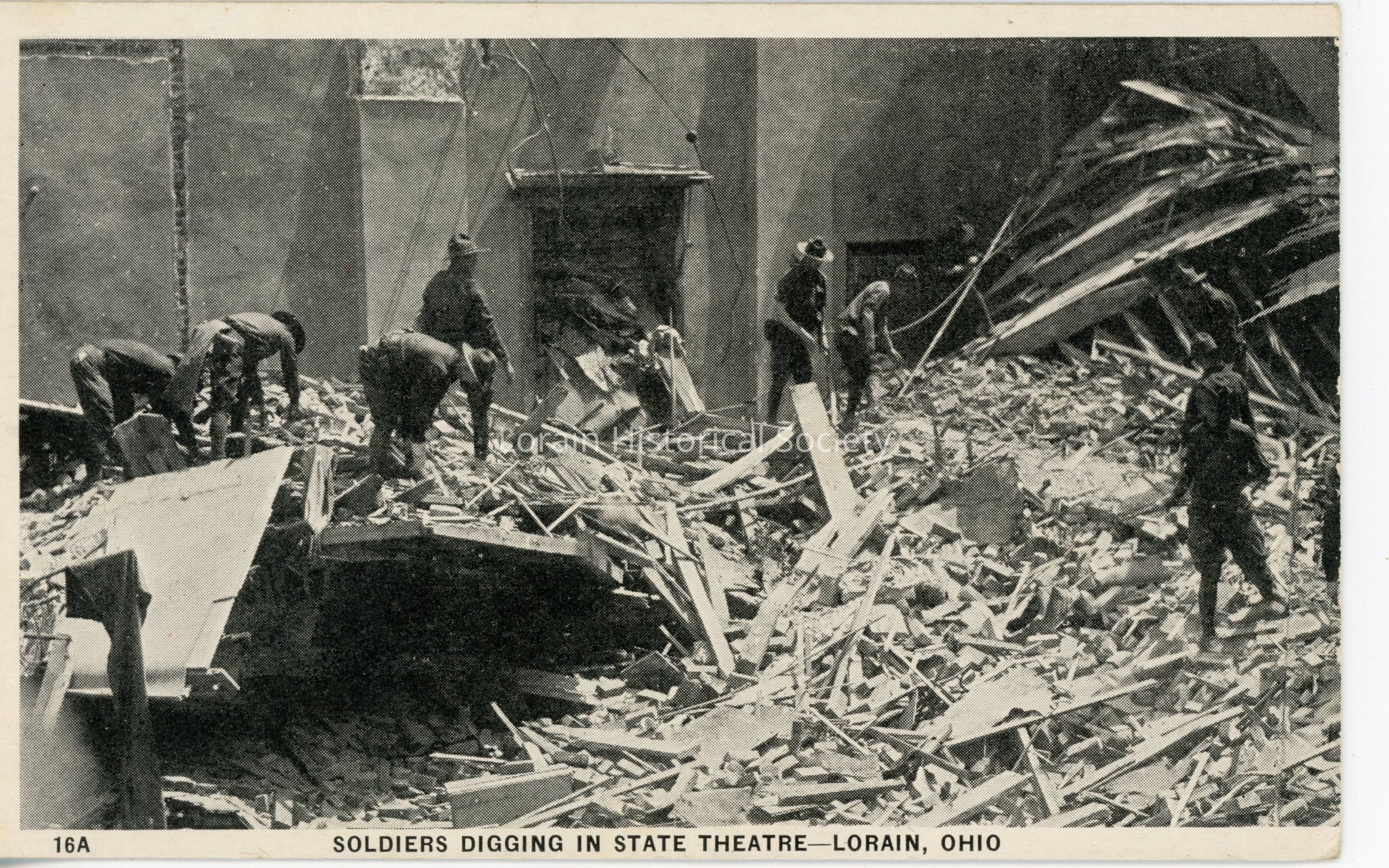 11/16/2022 AMS: cd07090145. jfm040808032. Black and white postcard is view of soldiers digging in ruins of State Theatre on 6/25/1924, day after Lorain, OH Tornado. Tornado hit city at 5:15 p.m. Many people were in the State Theatre. The roof fell in killing many. (More people dead here than in any other one location). Postcard reads: "16A. Soldiers Digging In State Theatre - Lorain, Ohio".