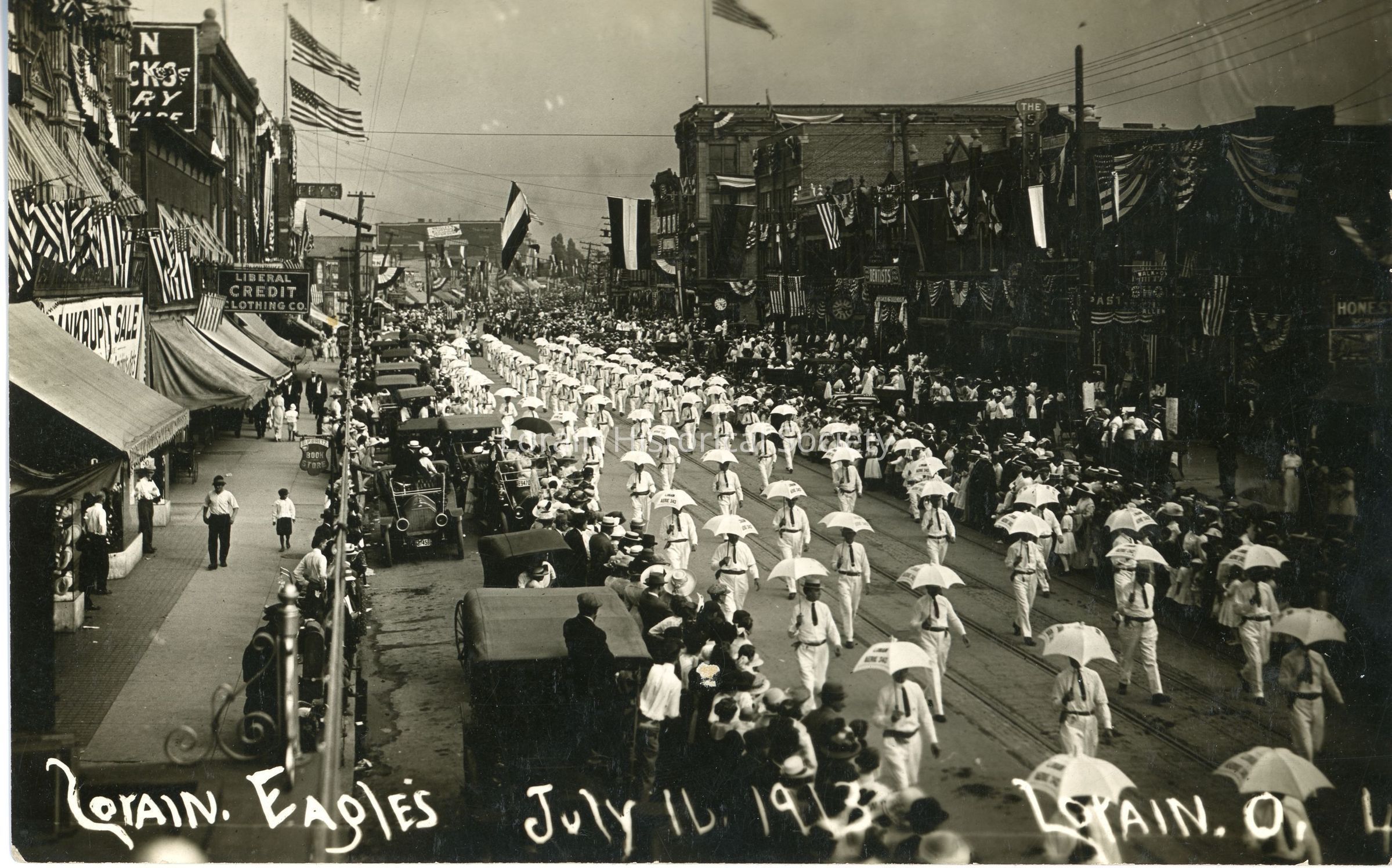 A black and white postcard photo featuring the Lorain Eagles, dressed in white carrying white umbrellas, in a parade down Broadway Ave. Photo taken from beside the Duane Building, which is in view on the far left.