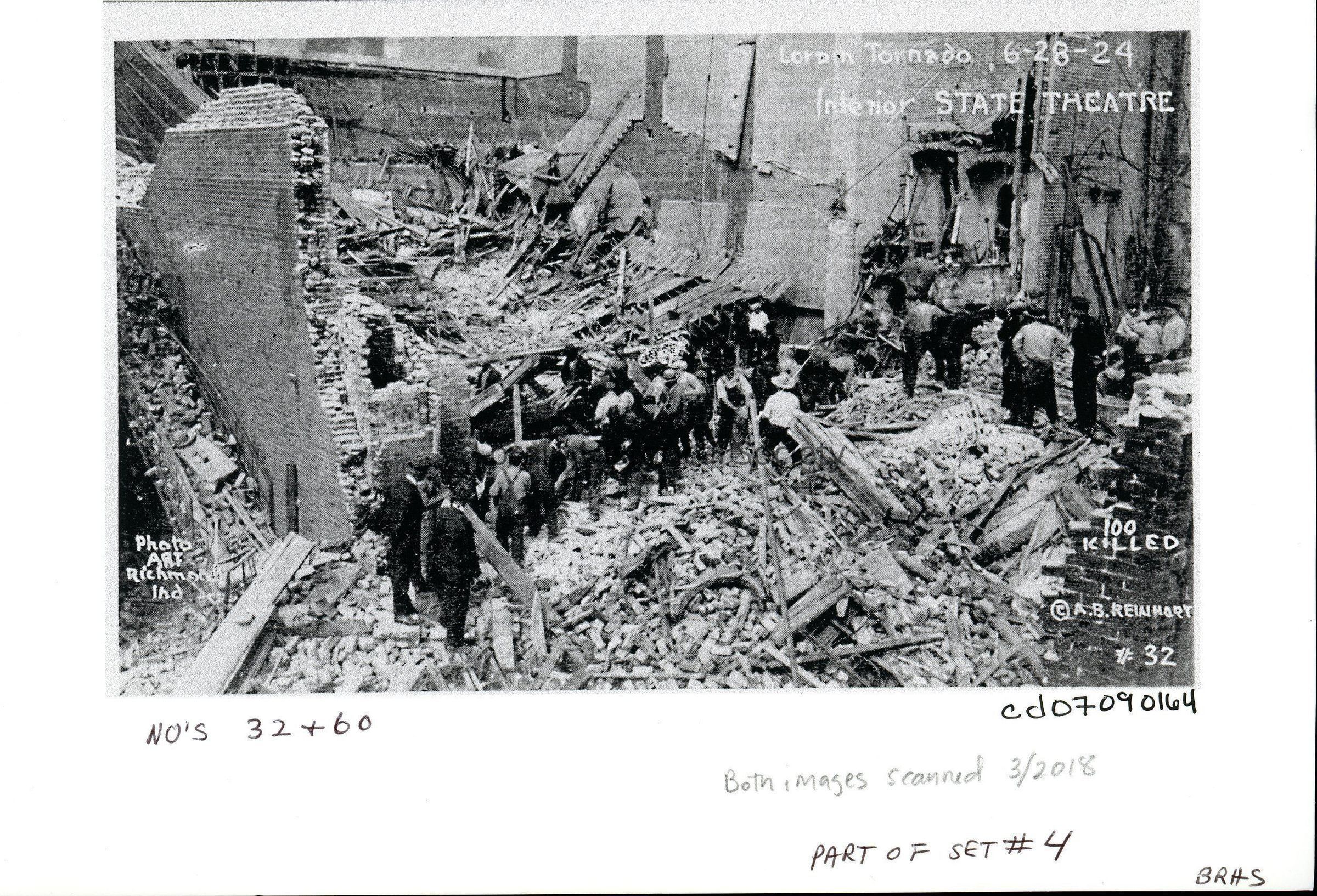 Postcard photocopy is black and white view of workmen searching in the wreckage of the State Theatre after the 1924 Tornado. Postcard reads: "LORAIN TORNADO, 6-28-24 Interrior STATE THEATRE 100 KILLED Photo Art Richmond, Ind. A. B. Reinhart #32".Acquisition