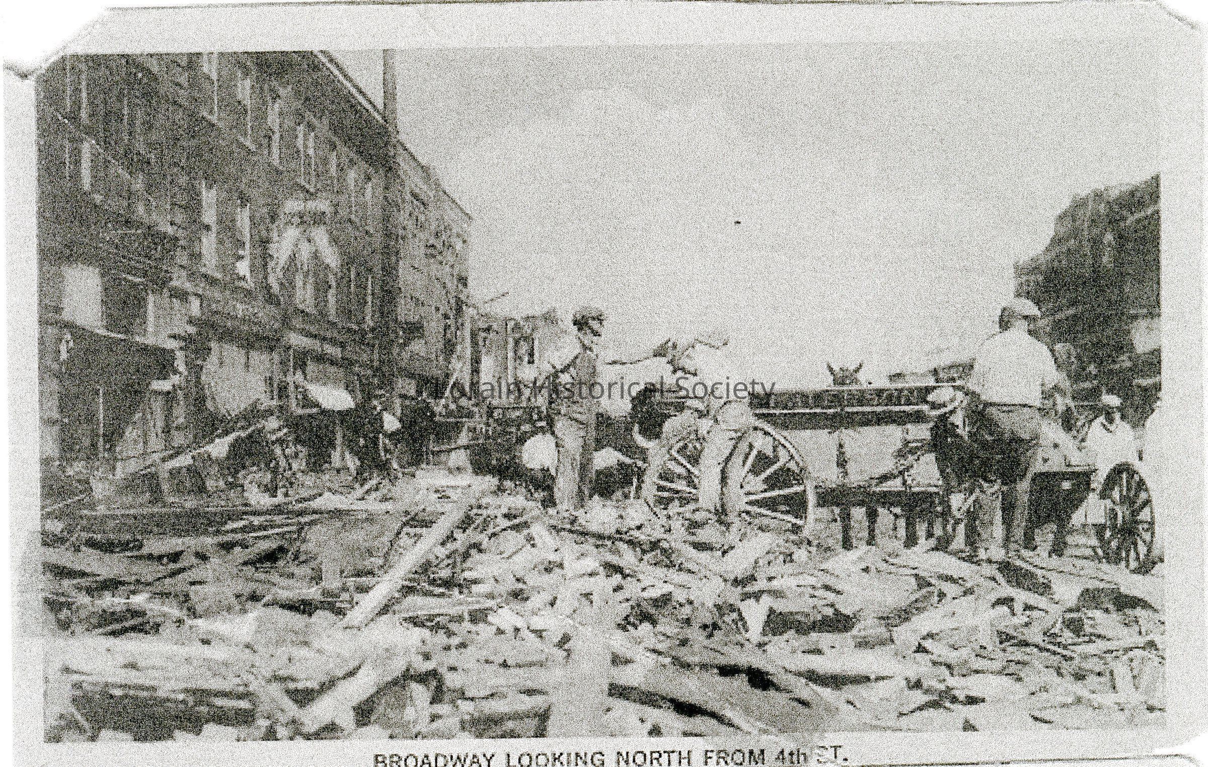 Black and white postcard photocopy is view of Broadway looking north from West Fourth Street showing workers removing debris from 1924 Tornado. Postcard reads: "Broadway Looking North From 4th".