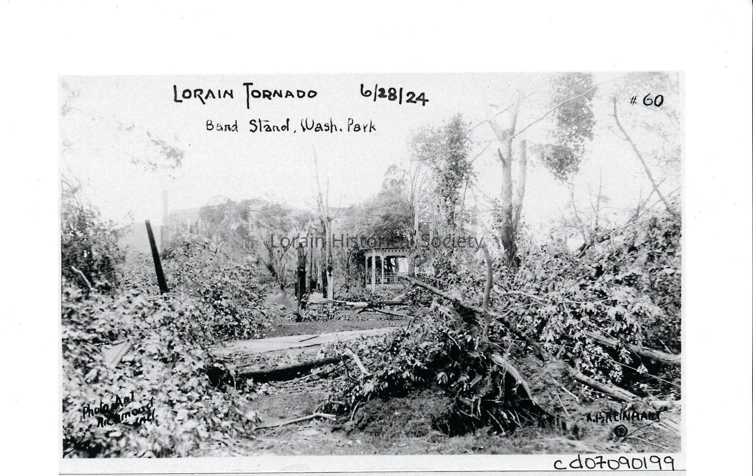 Postcard photocopy is black and white view of Washington Park Bandstand showing destruction and damage from 1924 Tornado. Postcard reads:"Lorain Tornado 6/28/24 Band Stand, Wash. Park 100 Killed #60 Photo Art Richmond, Ind. A. B. Reinhardt".Acquisition