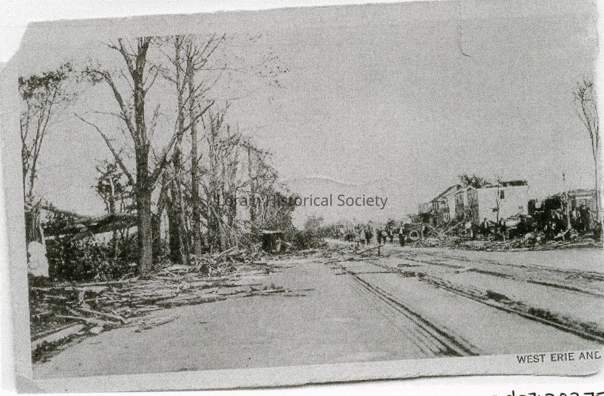 Black and white postcard photocopy is view of West Erie Avenue showing damage, destruction and debris from 1924 Tornado. Streetcar overturned in background on left. Postcard reads: "West Erie Ave.".
