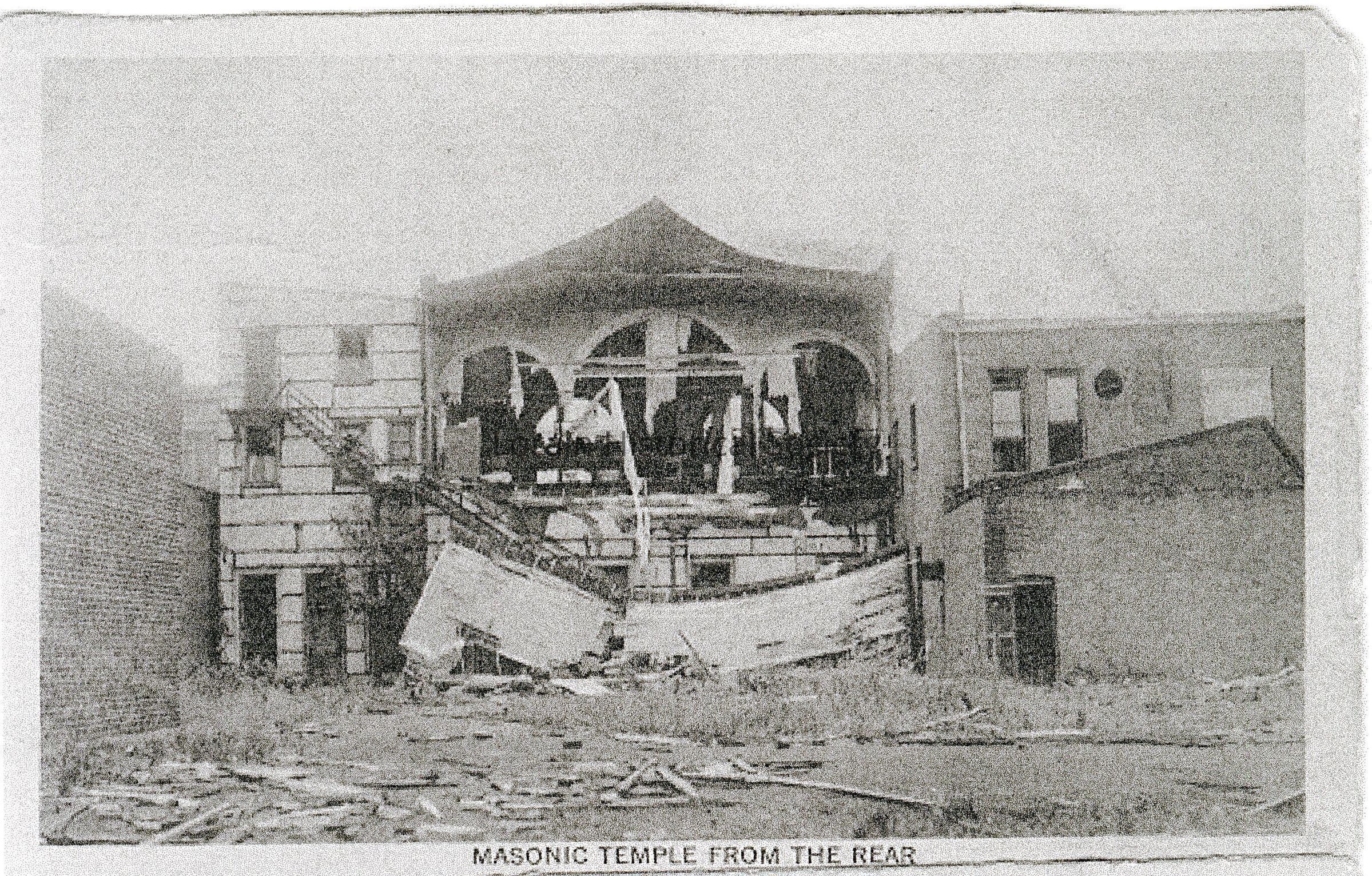 Black and white photocopy is view of rear of Masonic Hall, 675 Broadway, showing damage from 1924 Tornado. Postcard reads: "Masonic Temple From The Rear".Acquisition