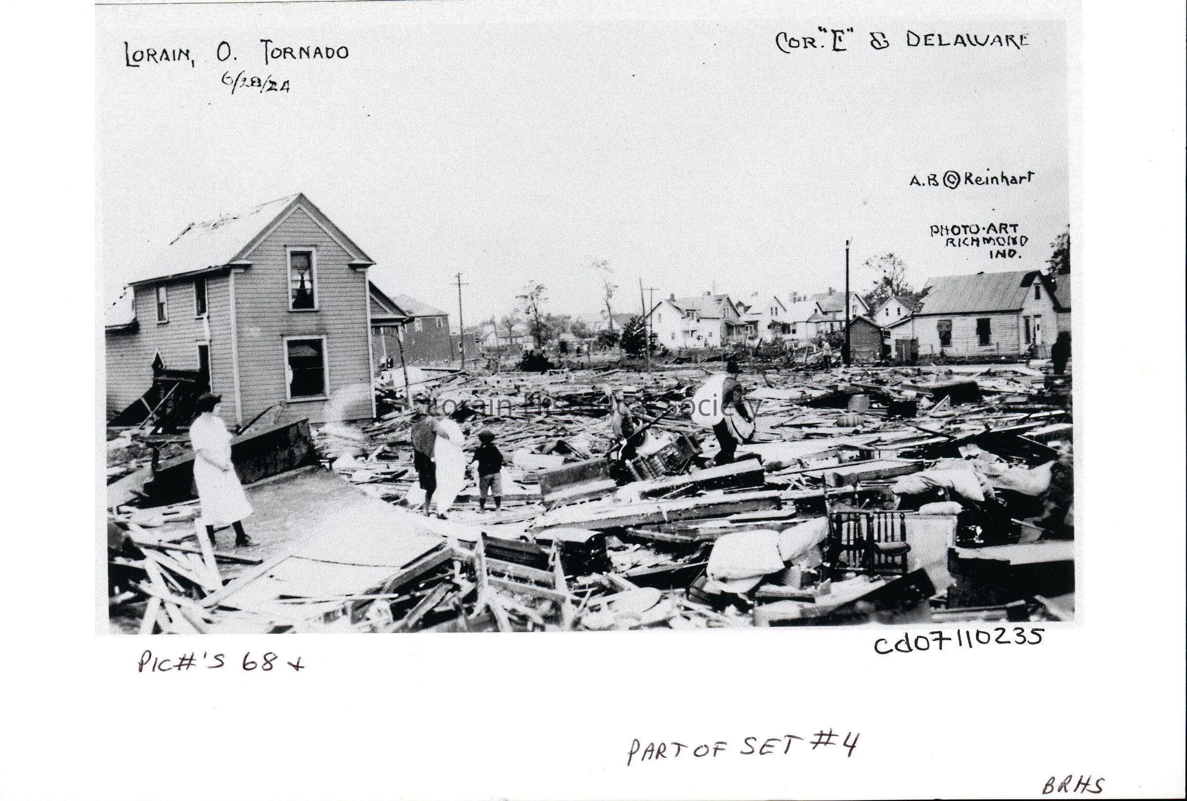 Postcard photocopy is black and white view of the corner of E Street and Delaware Avenue (Lorain's East Side), showing damage and destruction from 1924 Tornado. Postcard reads: "Lorain, O. Tornado 6/28/24 Cor. "E" & Delaware A. B. Reinhart Photo Art Richmond, Ind."Acquisition