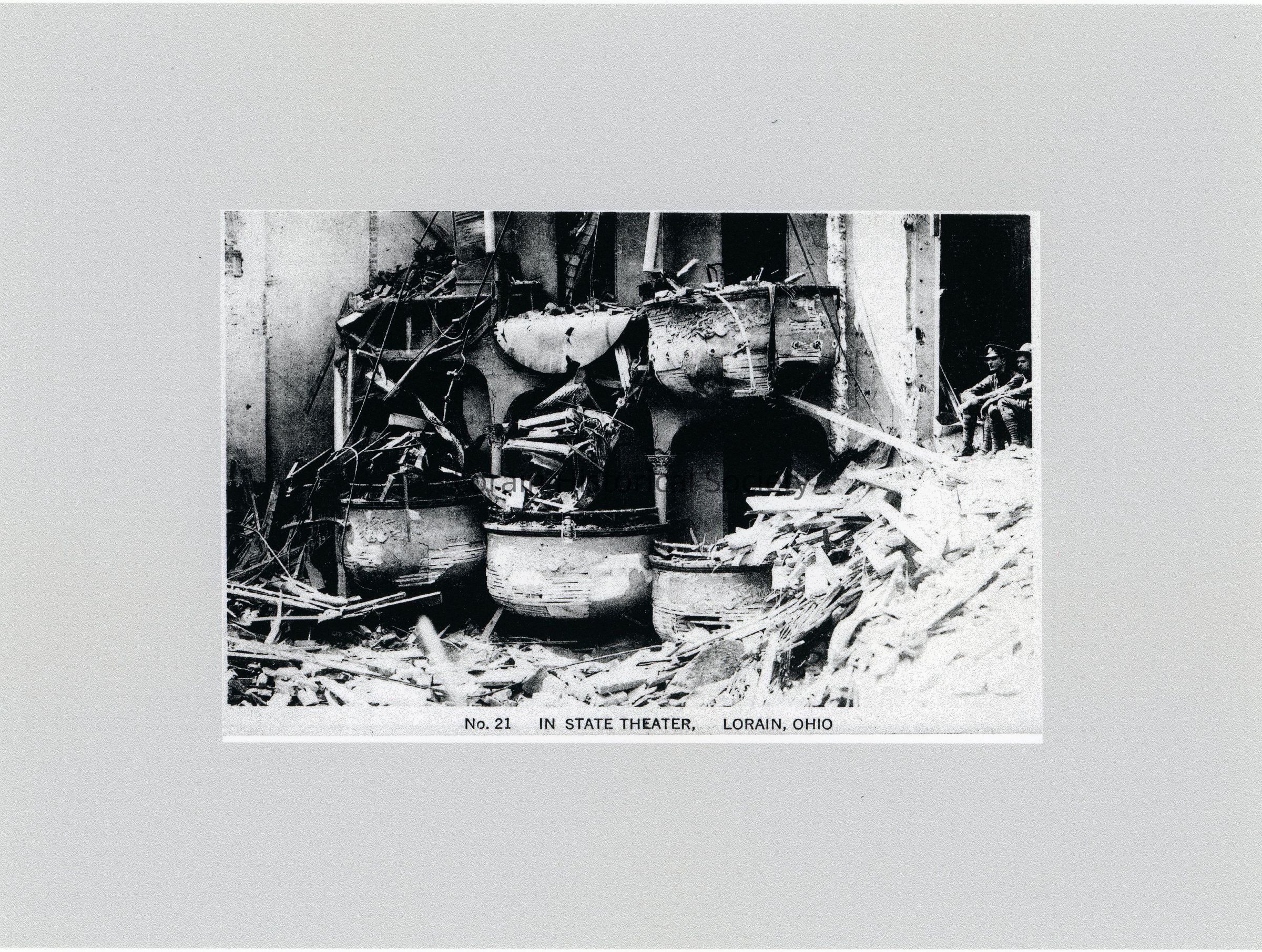 Postcard photocopy is black and white view of balconies in State Theatre, 375 Broadway, showing destruction from 1924 Tornado. Postcard reads: "No. 21 In State Theater, Lorain, Ohio".Acquisition