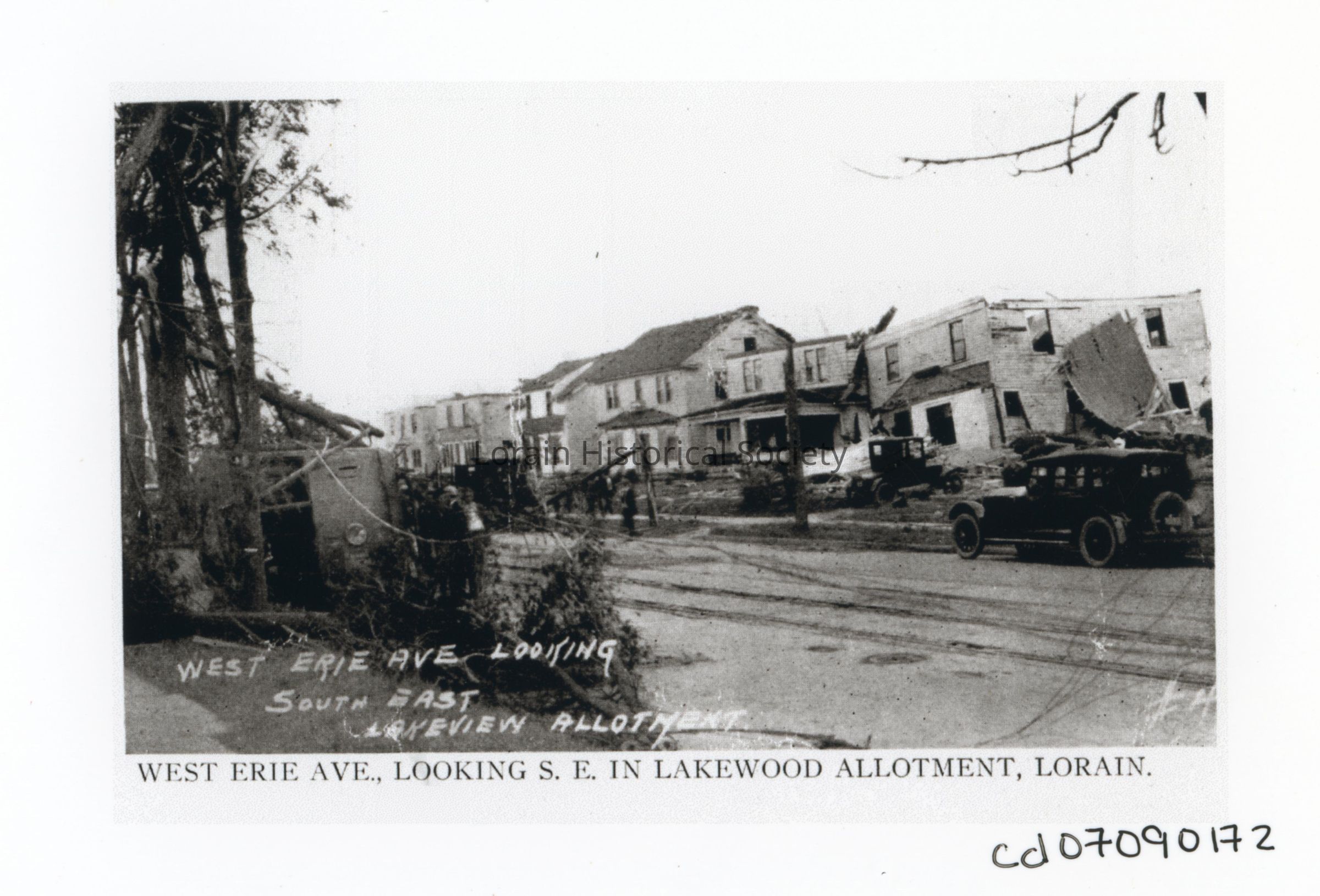 Photograph of postcard is black and white view of unidentified houses on West Erie Avenue in Lakeview Allotment, looking southeast, showing damage, destruction and debris from 1924 Tornado. Overturned streetcar on West Erie Avenue in in left foreground.Photograph Details