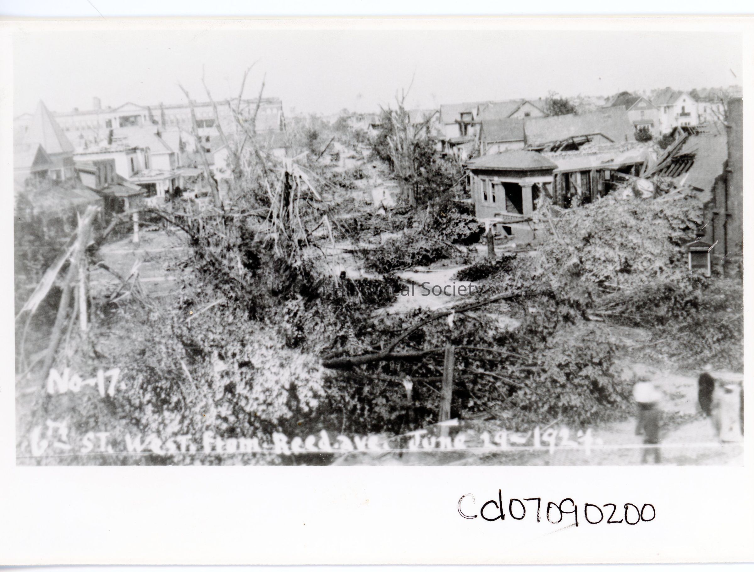 Postcard photograph is view of unidentified houses on West Sixth Street looking west from Reid Avenue showing damage and destruction from the 1924 Tornado. Postcard reads: "No.-17. 6th St. West From Reed Ave. June 24. 1924".Acquisition