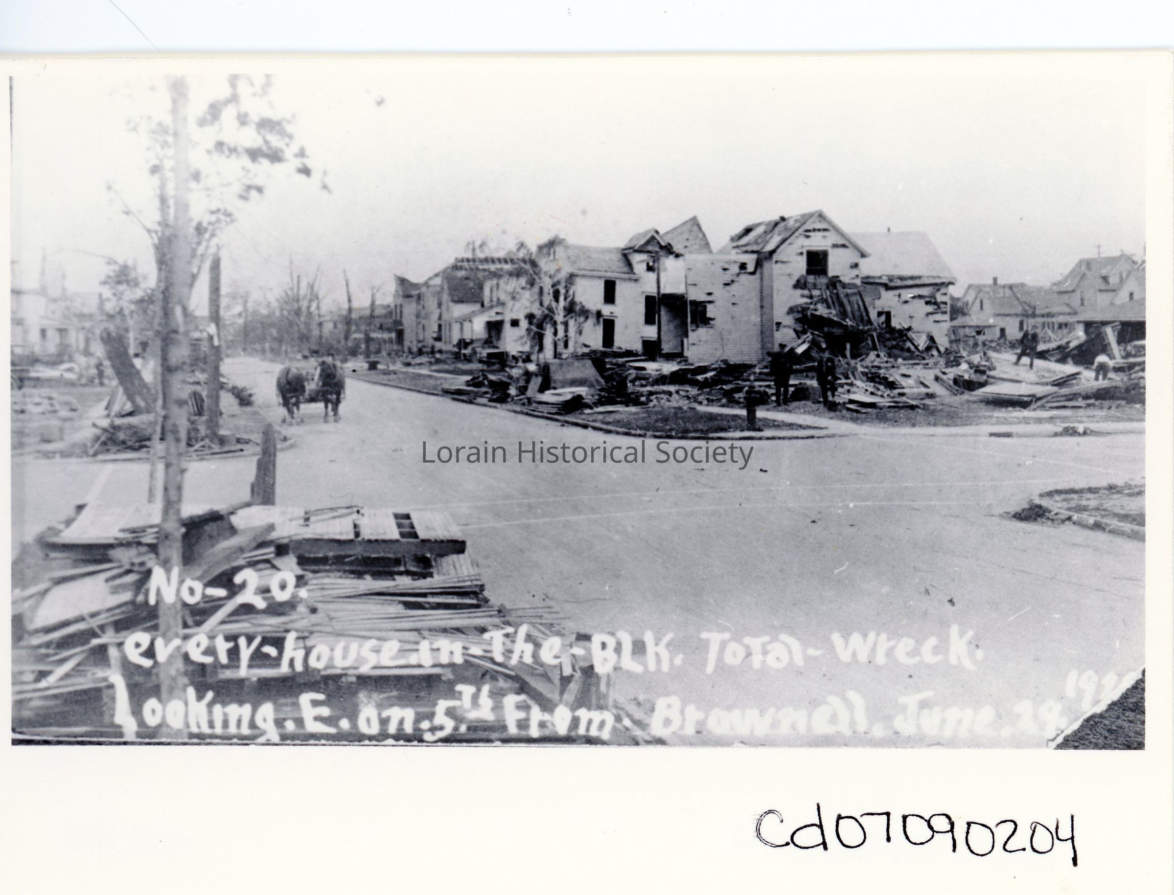 Postcard photograph is black and white view of unidentified houses on West Fifth Street, looking East from Brownell Avenue, showing damage and destruction from the 1924 Tornado. Postcard reads: "No. 20. every house on The BLK. Total Wreck. Looking E. on 5th From Brownell. June 29, 1924".Acquisition