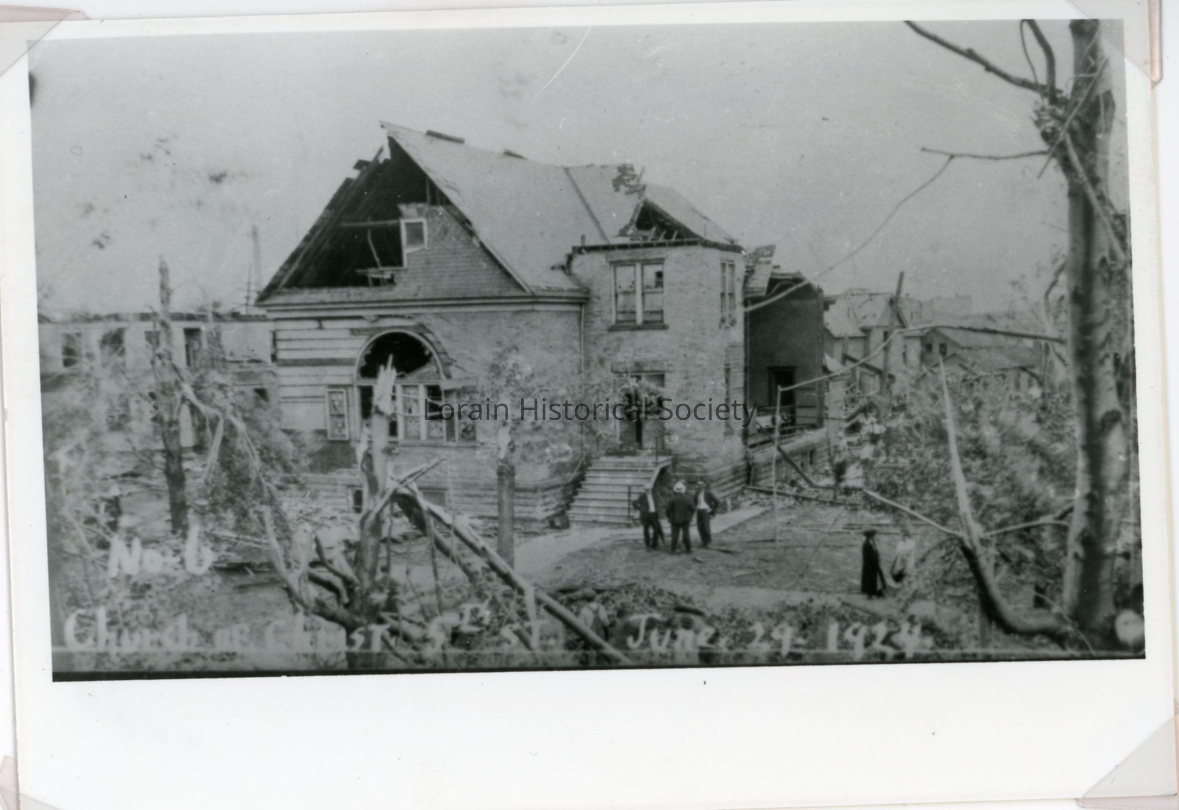 Photograph of postcard is black and white view of First Church of Christ, 210 West Fifth Street, showing damage and destruction from 1924 Tornado.