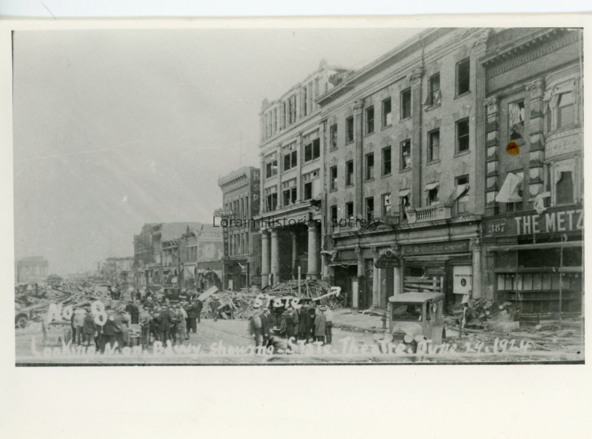 Photograph of postcard is black and white view of Broadway looking looking north indicating the entrance to The State Theatre and showing damage, destruction and debris from the 1924 Tornado.