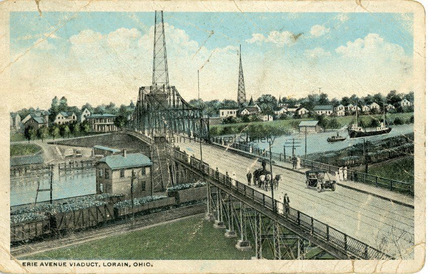 A color postcard drawing of the swing bridge in Lorain titled, "Erie Avenue Viaduct, Lorain, Ohio", 2 copies