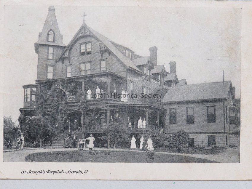A black and white photograph on a postcard of St. Joseph's Hospital - Lorain, Ohio. Even though we have photos in the historical society's collection of early St. Joseph's Hospital, it is the correspondence on the back which made us decide to accession it. Postmarked October 19, 1907 - It reads: